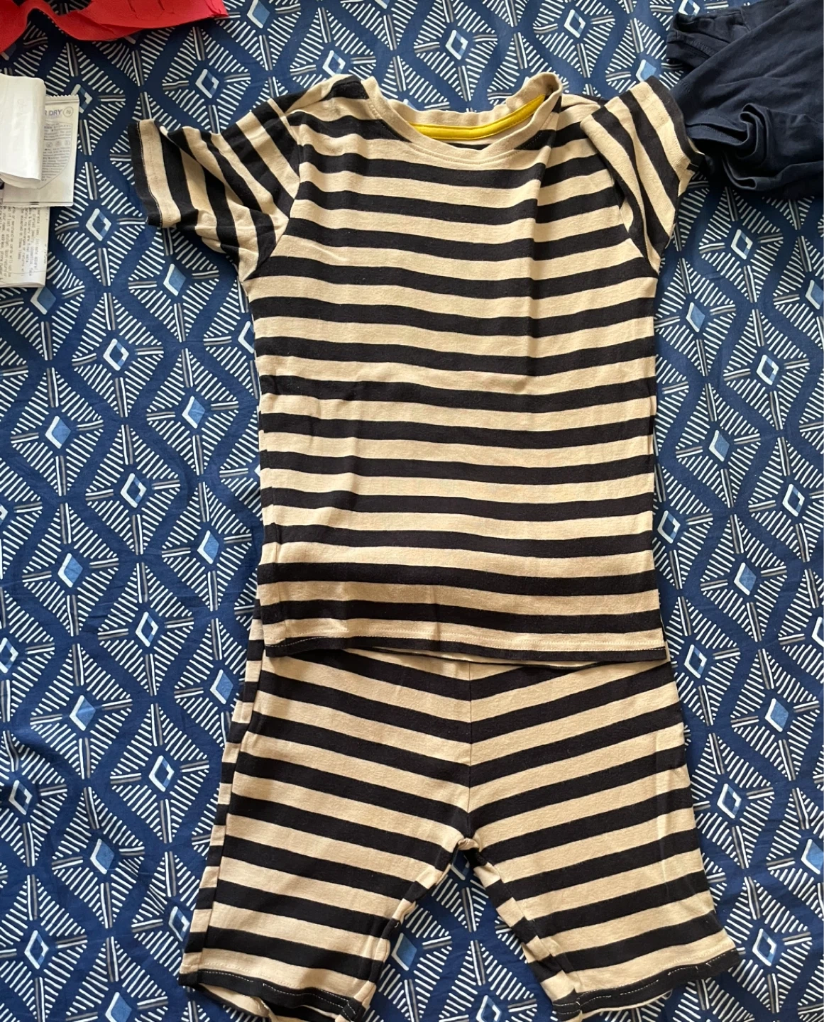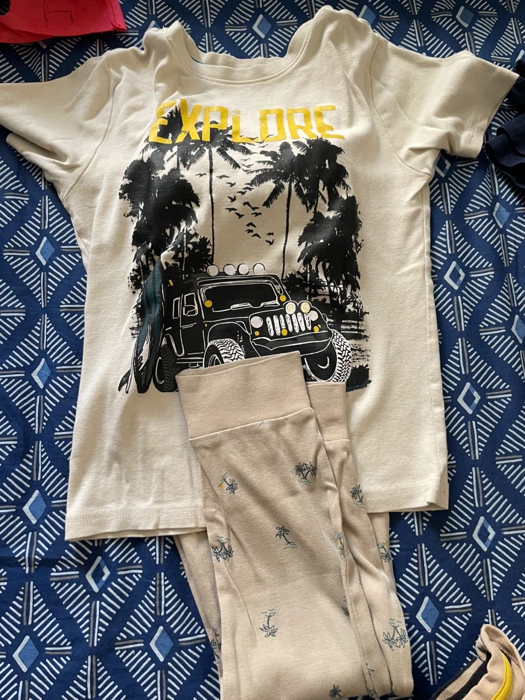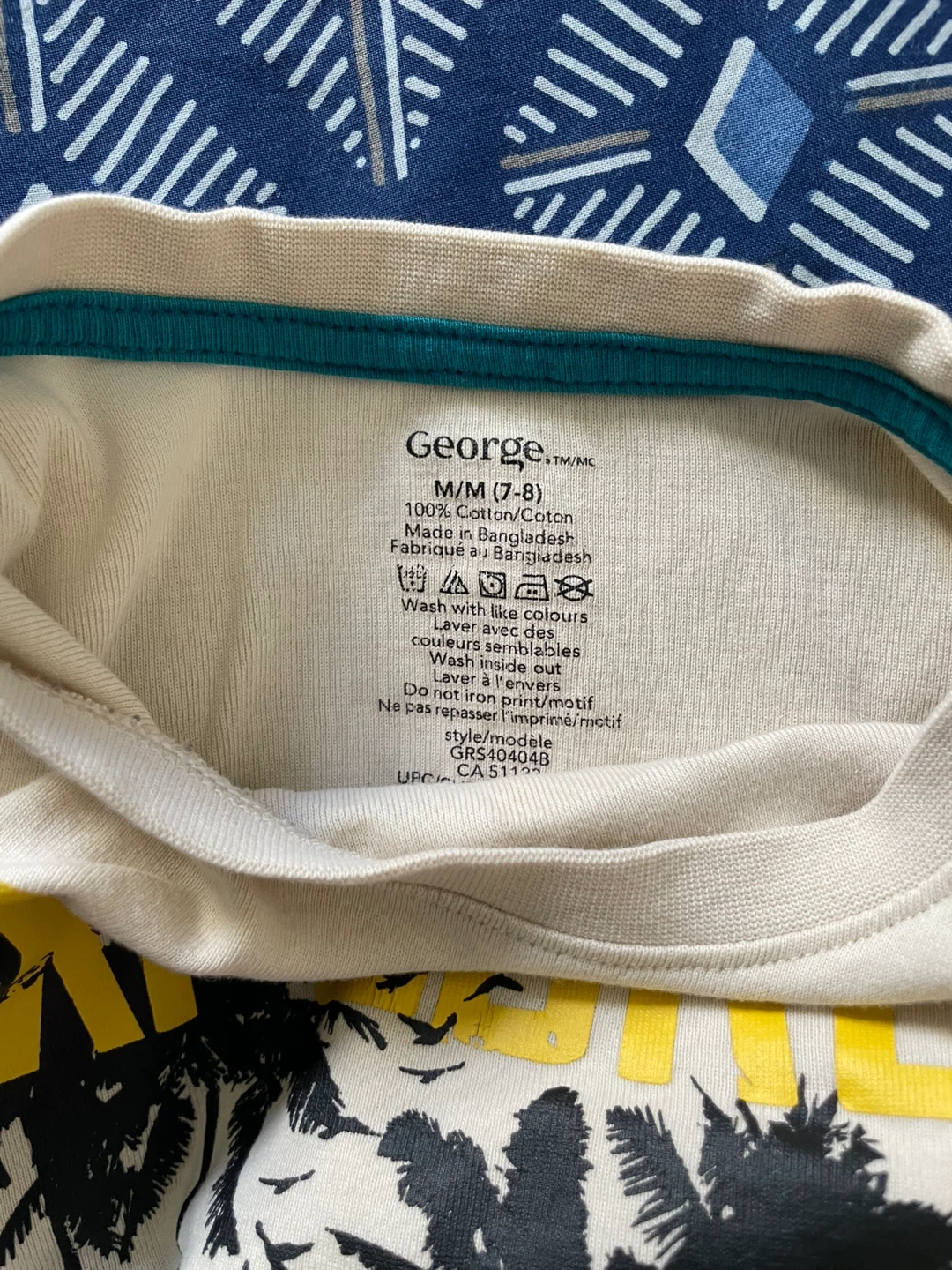 Here's a cute pajama set from George for boys! It's a size M (7-8). One set is a striped top and shorts, and the other is a cream-colored top with an "Explore" graphic and matching pants. Both are made of 100% cotton