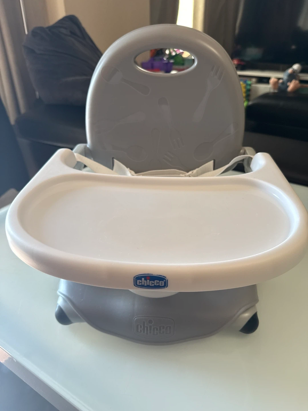 Selling a Chicco baby booster seat. It's in great condition and ready for a new home! Perfect for meal times and easy to clean. The seat is grey and features a tray.