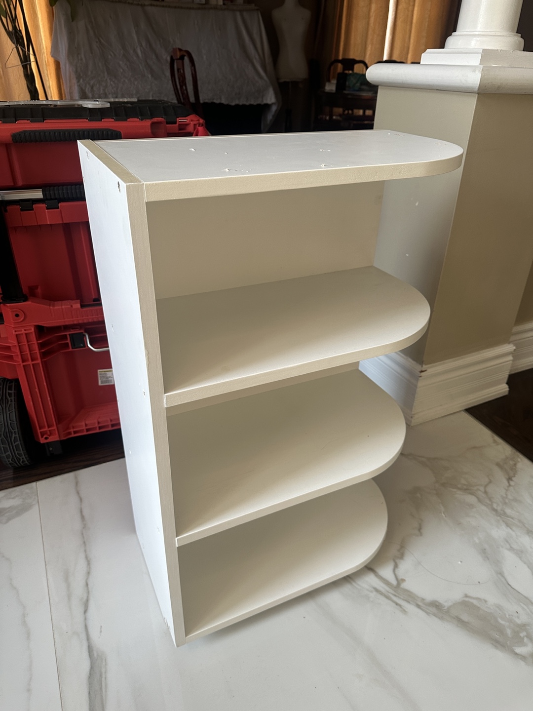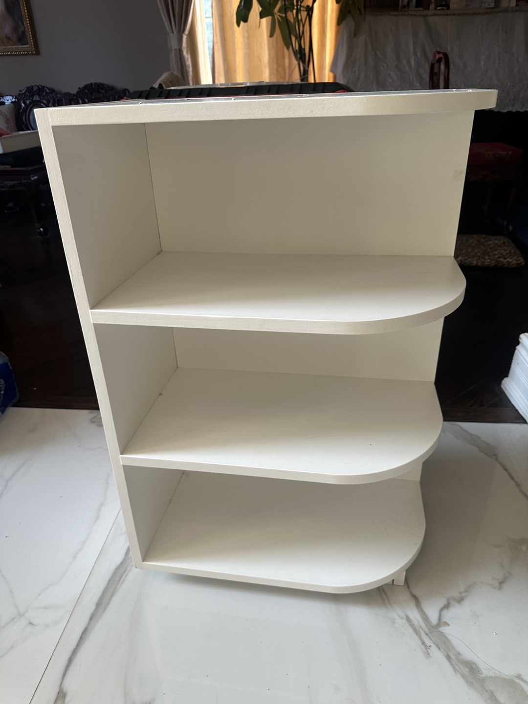 New: white corner shelf! It has three shelves and is perfect for small spaces or adding a bit of extra storage to any room.