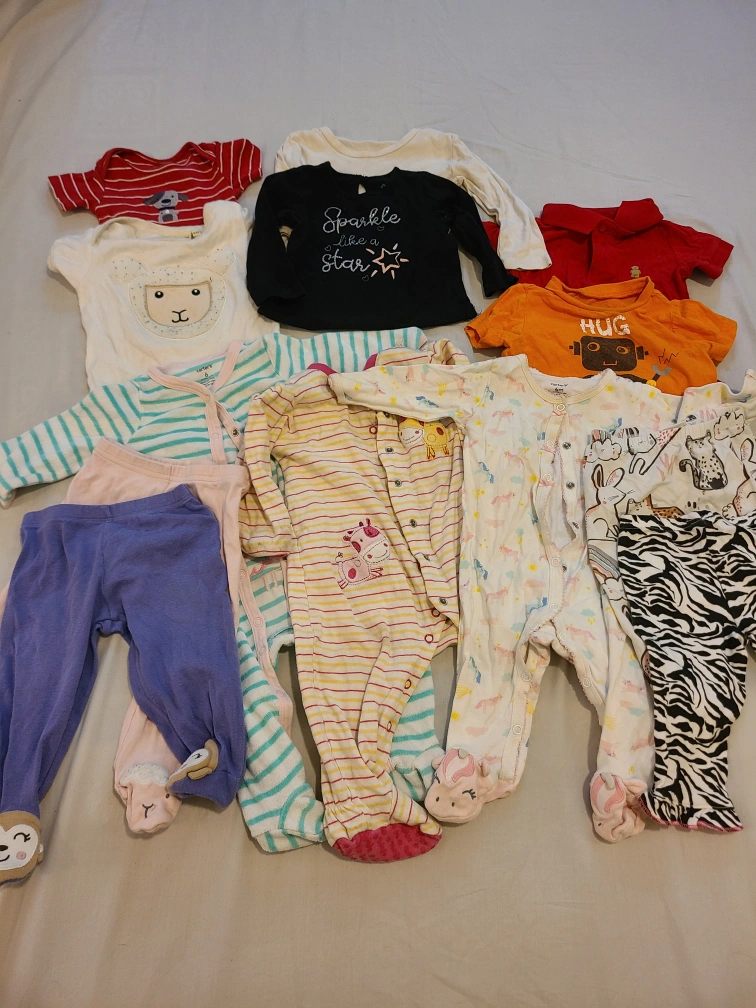 397A cute bundle of baby clothes! Includes onesies, shirts, and footed pants in various colours and patterns. All are gently used and ready for a new little one. - 2 onesies - 3 footed sleepers - 4 stretchy pants - 2 long-sleeve shirts - 2 short-sleeve shirts From a pet-free, smoke-free home Porch pickup near Lansdowne station