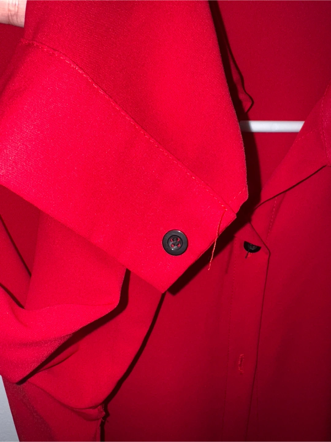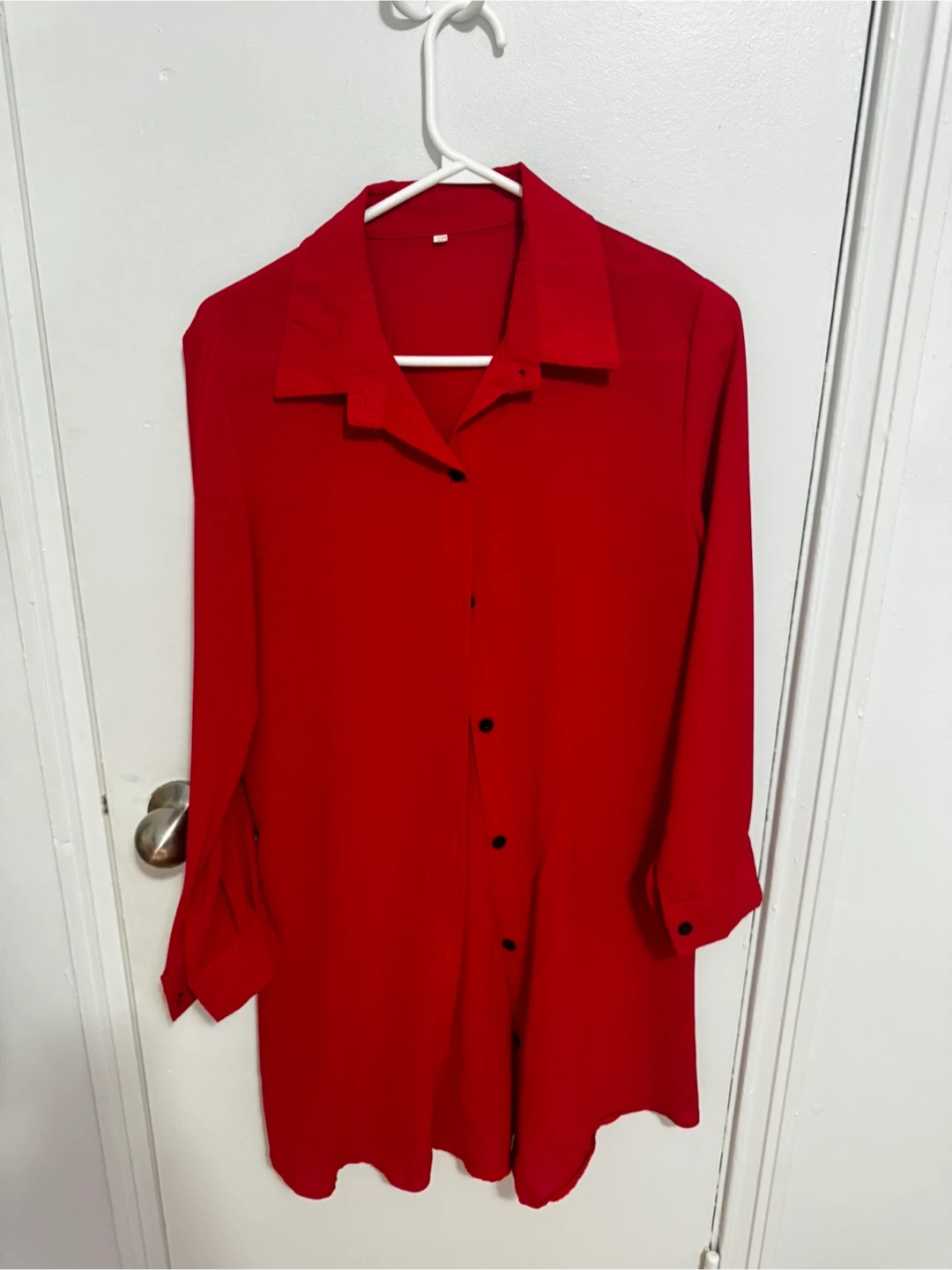 Here's a vibrant red button-down shirt! It features a classic collar and buttoned cuffs. Perfect for adding a pop of colour to your wardrobe