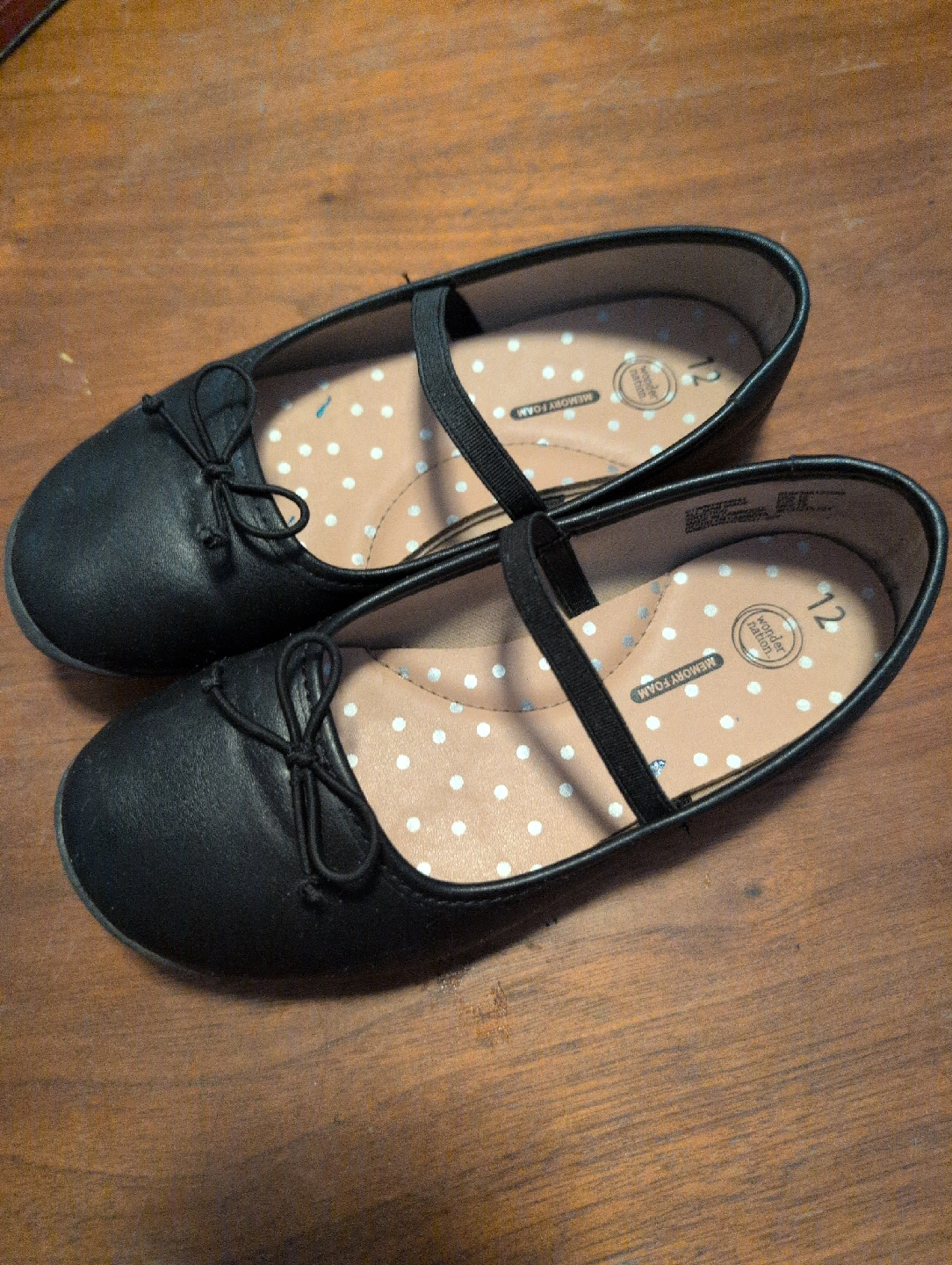 These are a pair of gently used black ballet flats from Wonder Nation! They're in great shape and a size 12. Perfect for your little one!