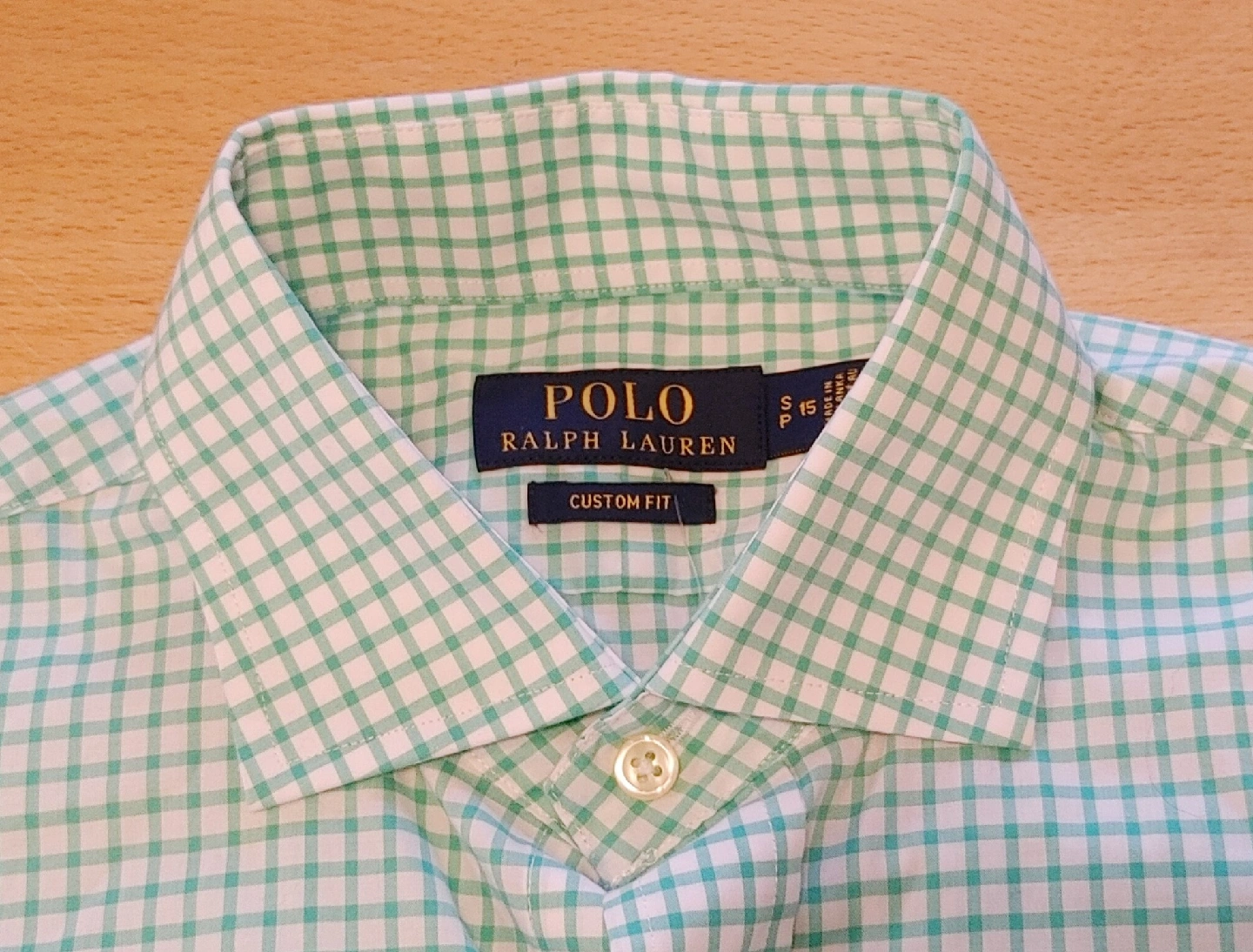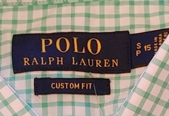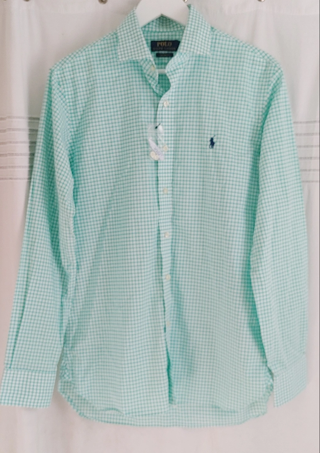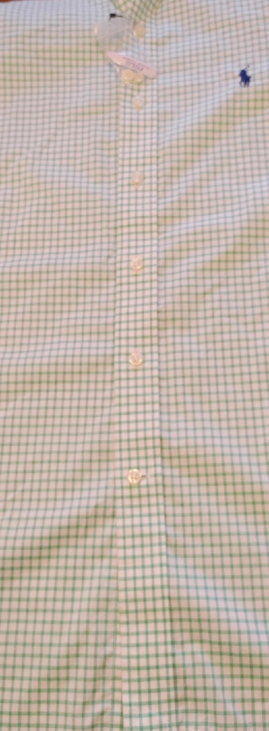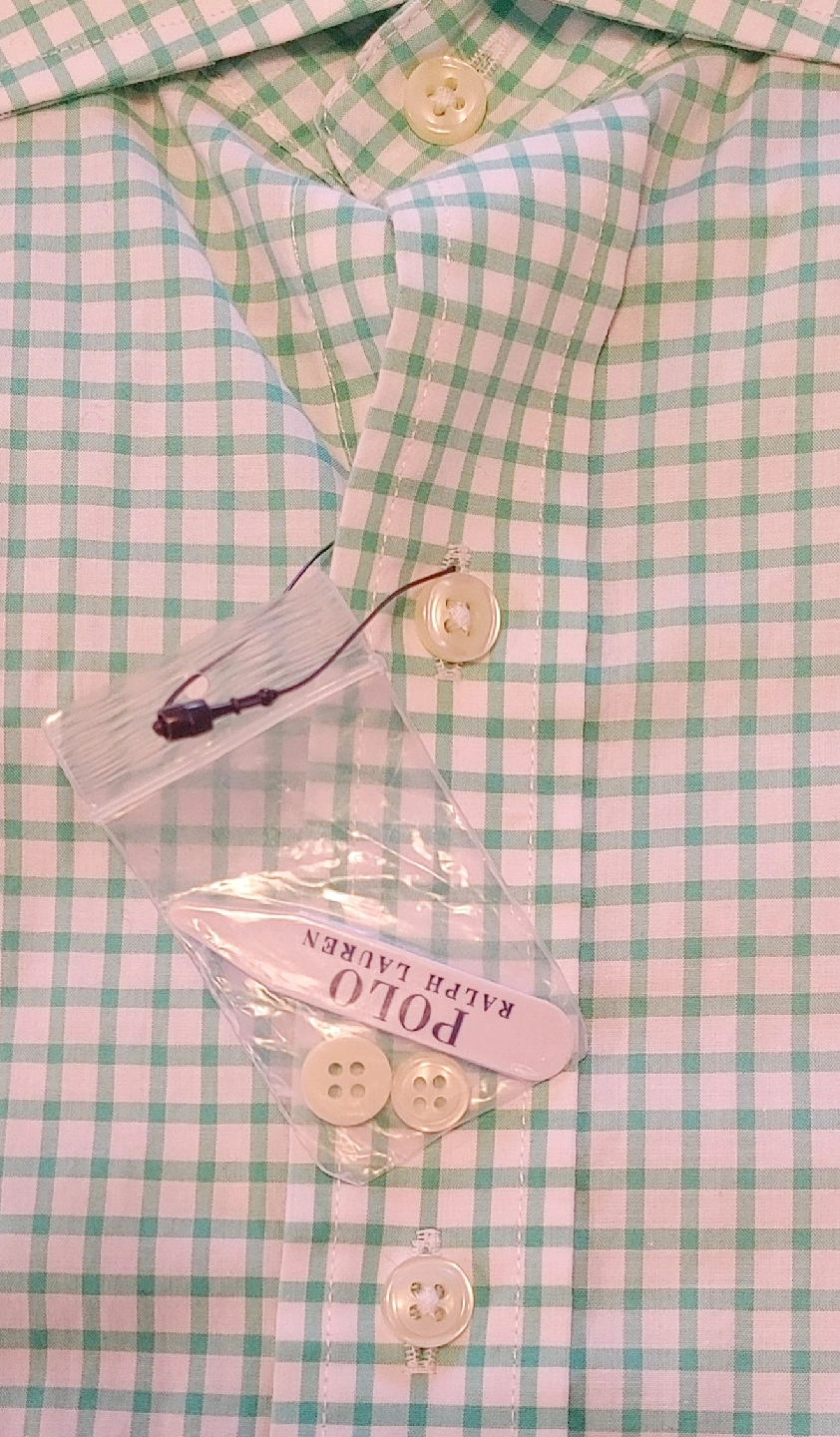 Men's size 15 Polo Ralph Lauren shirt with a green and white gingham pattern. Mint condition still with tags. New never worn. All buttons present with extras and collar tags. Smoke free home pick up Mt.Brydges cash only.