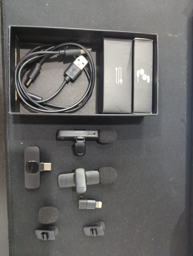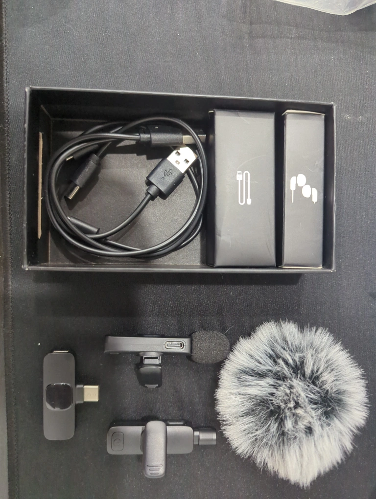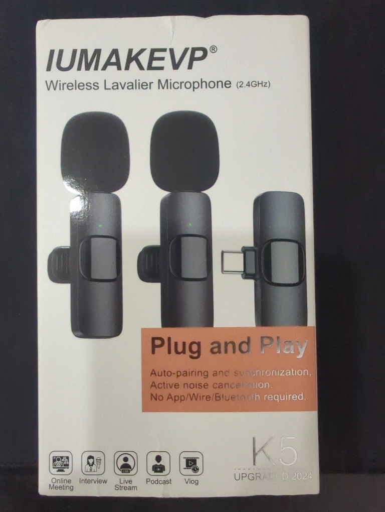 Selling a IUMAKEVP Wireless Lavalier Microphone K5! It's a plug-and-play device with auto-pairing and synchronization, plus active noise cancellation. No app, wire, or Bluetooth is required. Perfect for online meetings, interviews, live streams, podcasts, and vlogs. Comes with all original components and packaging!