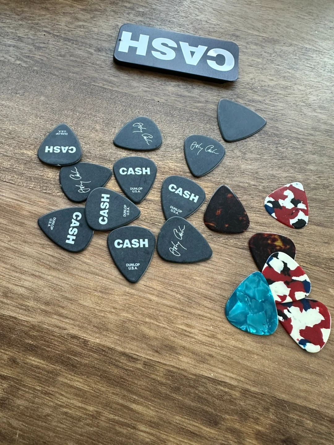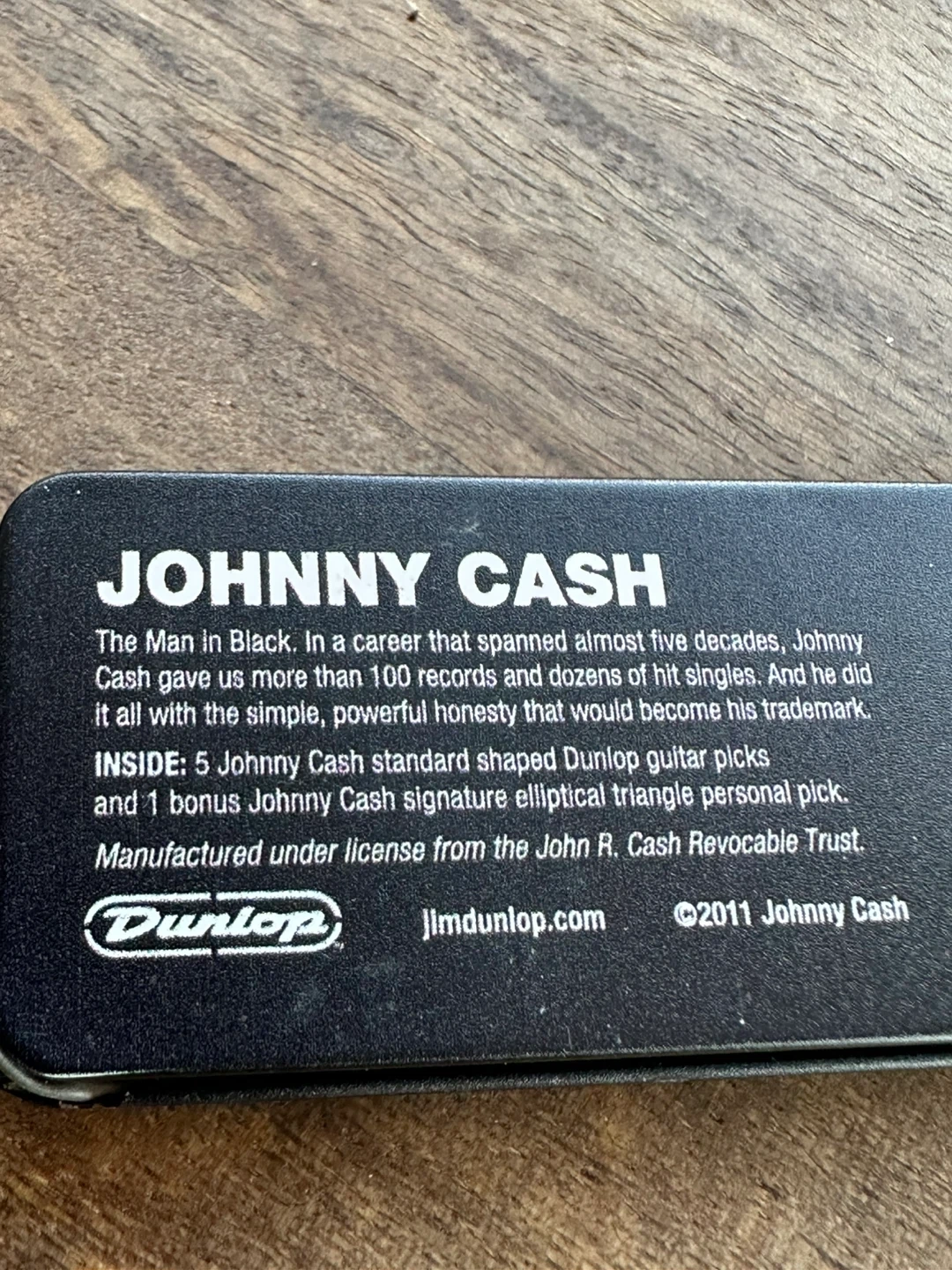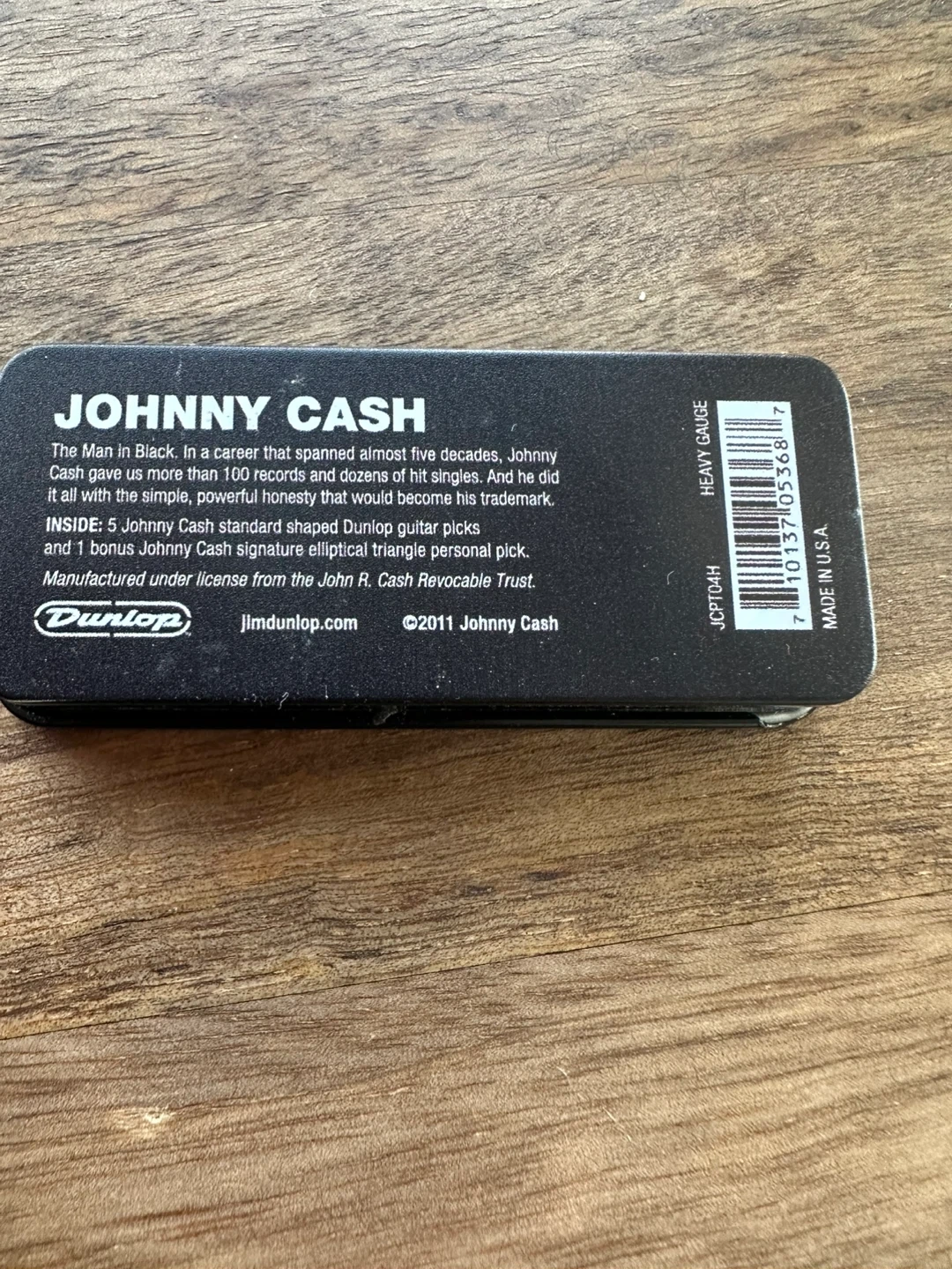85Selling a set of Dunlop Johnny Cash guitar picks! These are heavy gauge and come with a cool Johnny Cash tin. Inside, you'll find 10 standard shaped Dunlop guitar picks with the Johnny Cash signature, plus 1 bonus elliptical triangle pick and some other assorted guitar picks. Perfect for any Johnny Cash fan or guitar player Meet at king and shaw