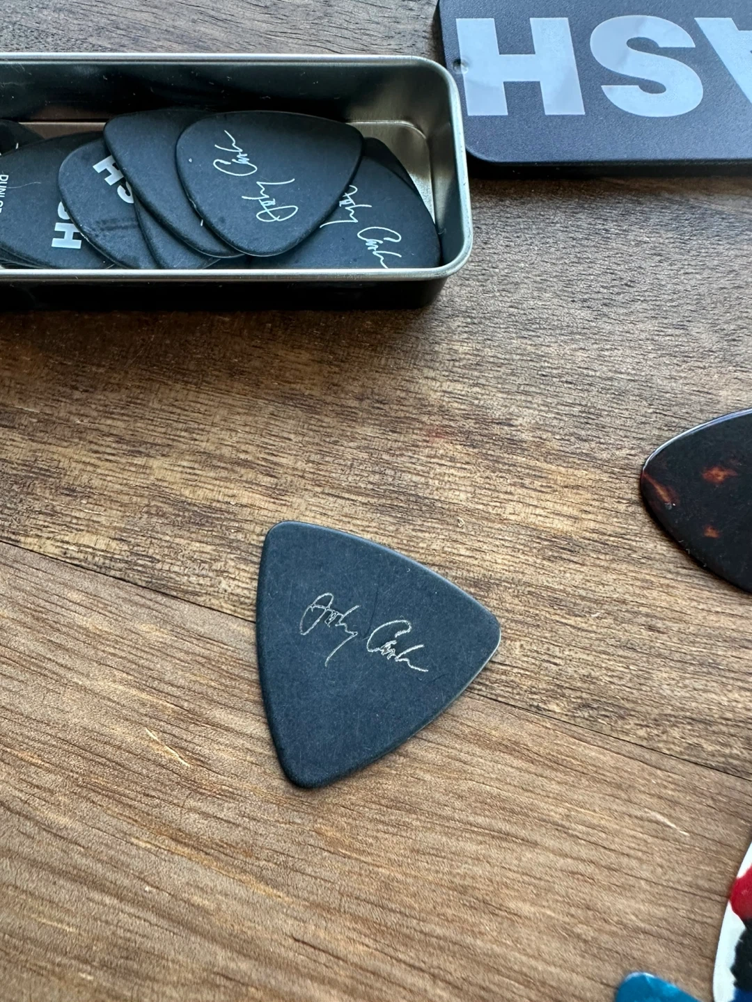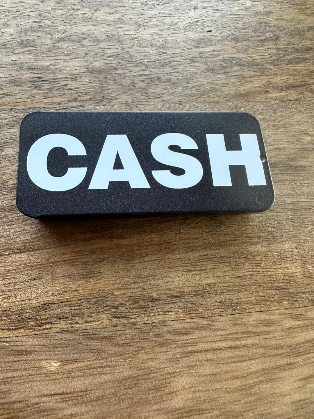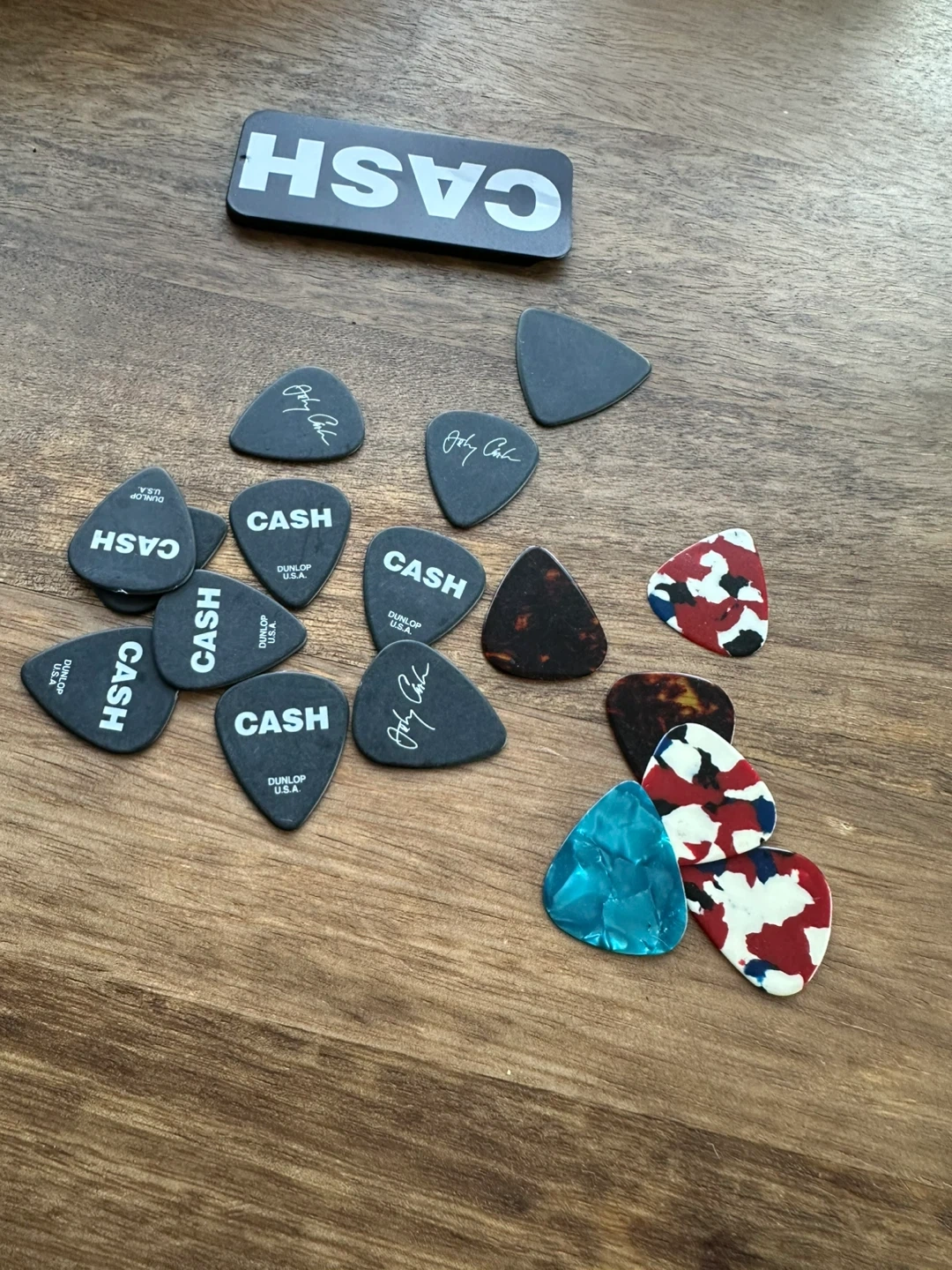 85Selling a set of Dunlop Johnny Cash guitar picks! These are heavy gauge and come with a cool Johnny Cash tin. Inside, you'll find 10 standard shaped Dunlop guitar picks with the Johnny Cash signature, plus 1 bonus elliptical triangle pick and some other assorted guitar picks. Perfect for any Johnny Cash fan or guitar player Meet at king and shaw