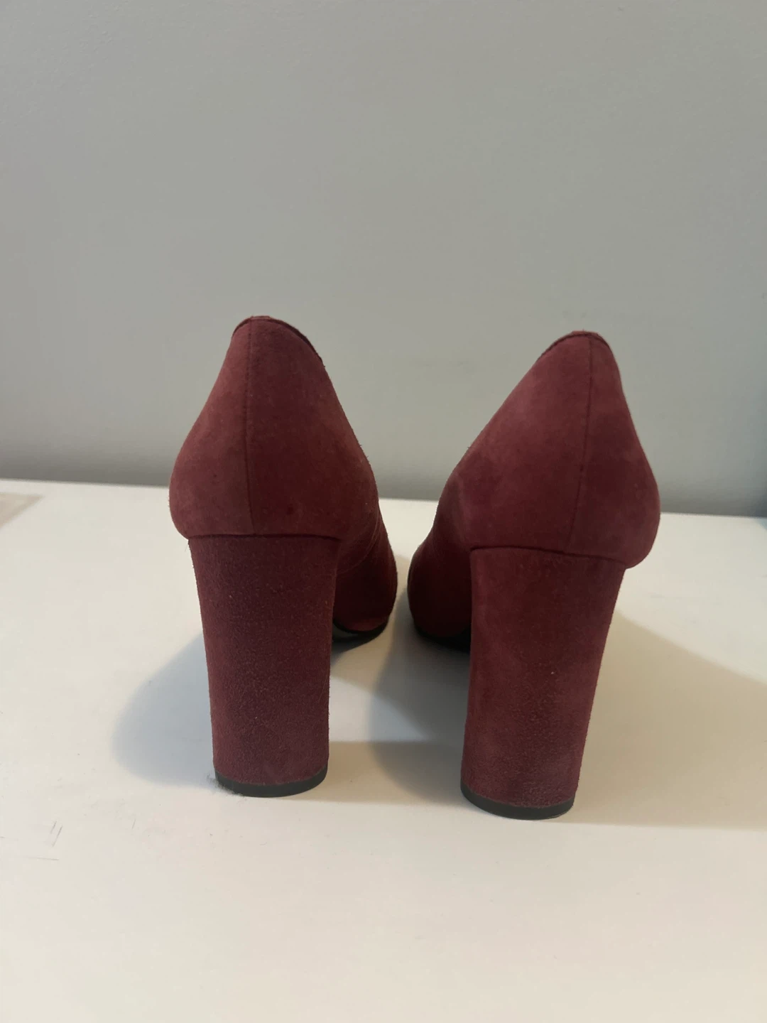 They feature a beautiful burgundy suede and are adorned with gold studs at the toes.