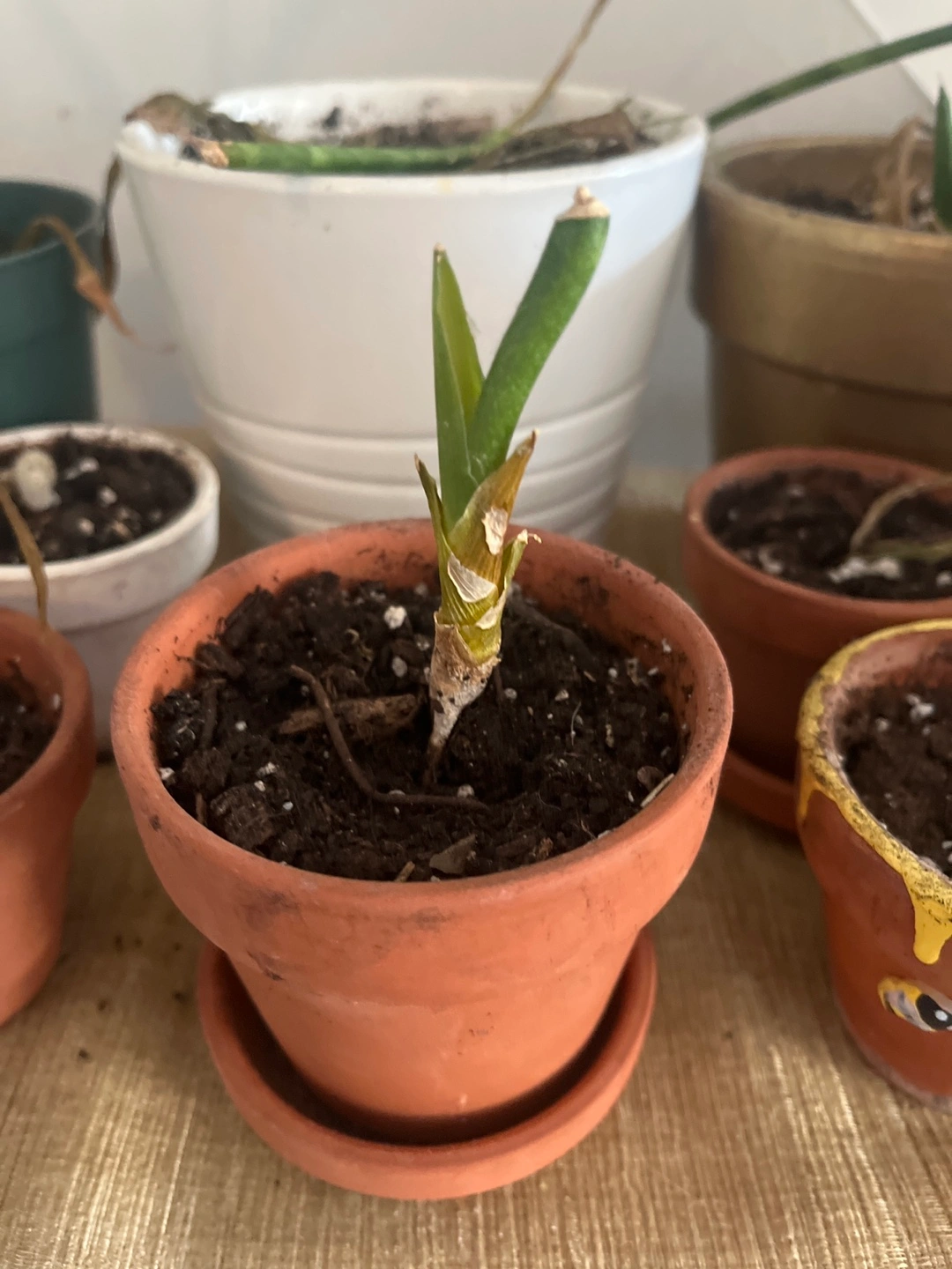 Selling a small potted plant. It comes in a terracotta pot with a matching saucer. Perfect for adding a touch of green to your space! Its a snake plant
