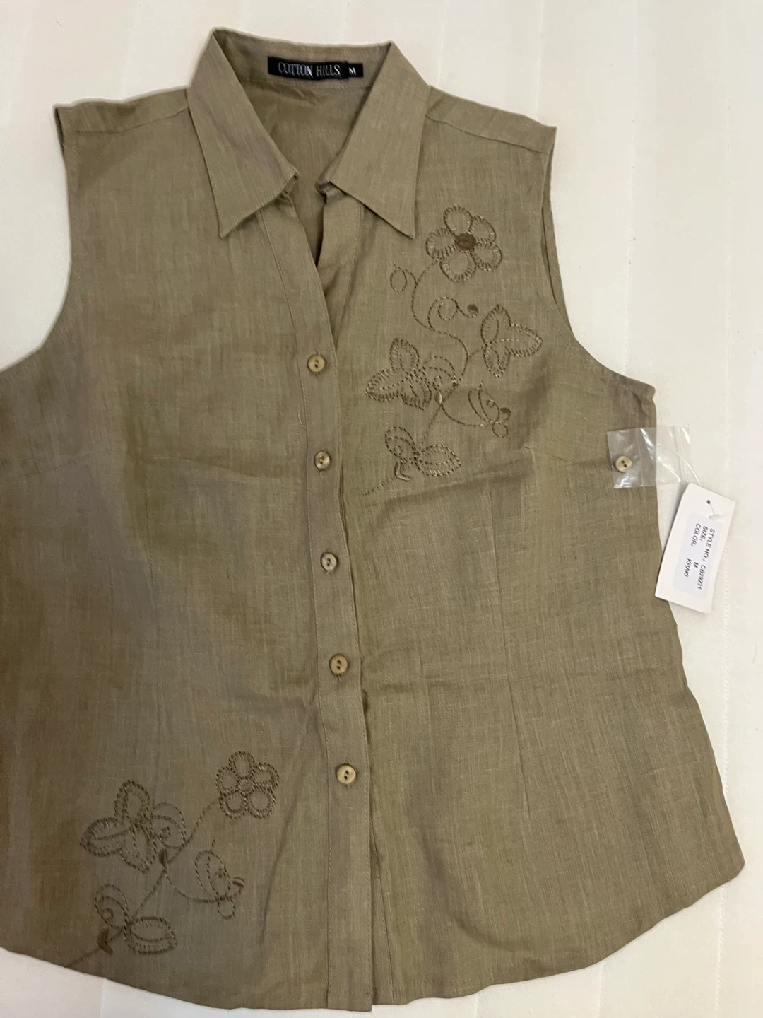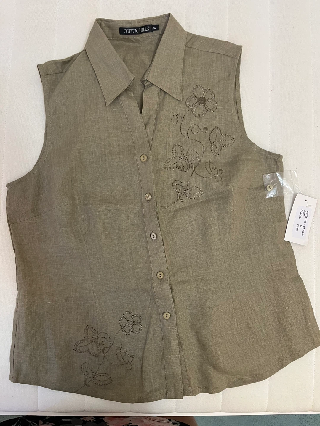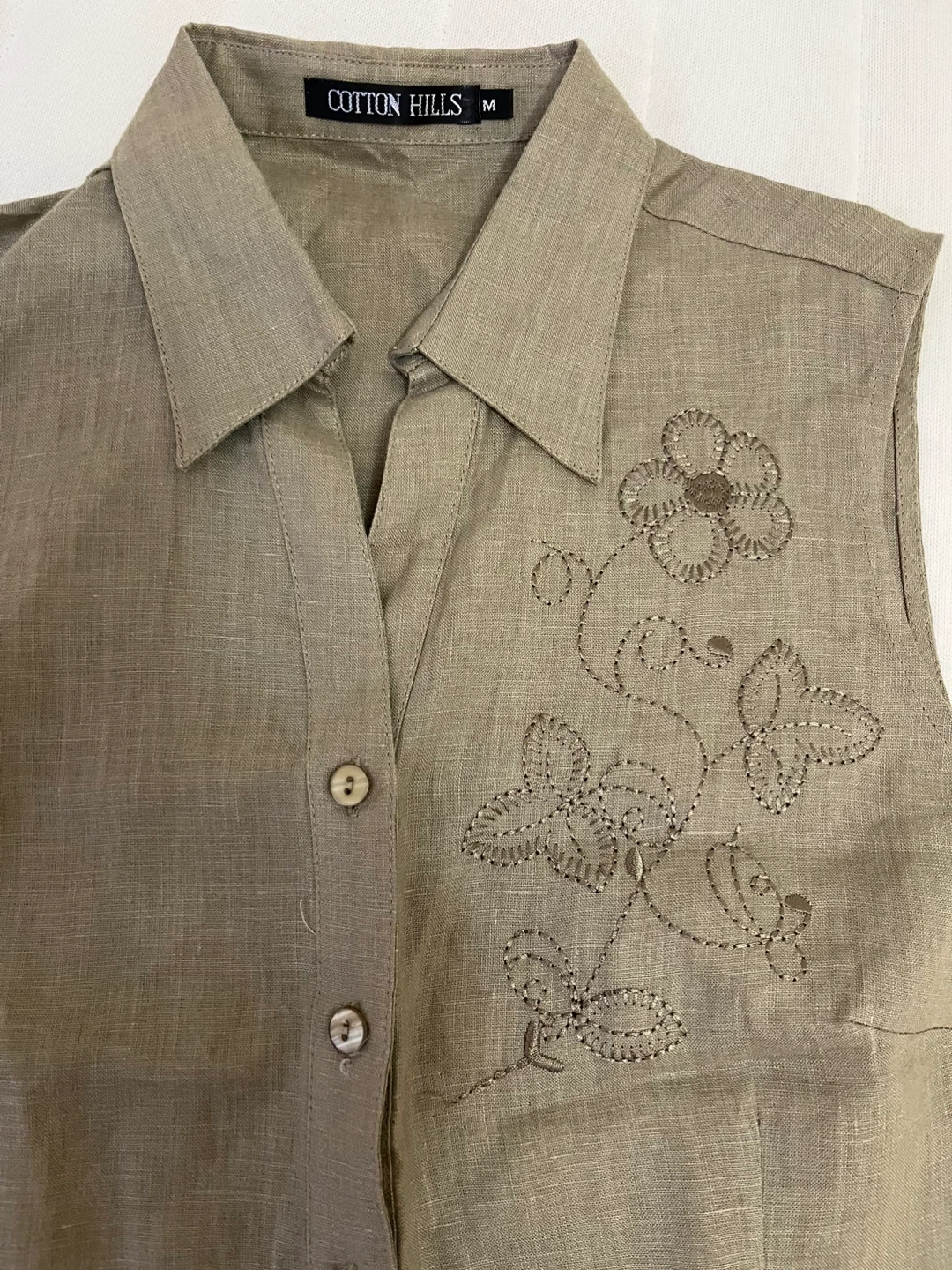 192Here's a lovely brand new sleeveless blouse from Cotton Hills! It's a size medium and comes in a neutral khaki colour. The blouse features delicate floral and butterfly embroidery. Perfect for a casual day out!