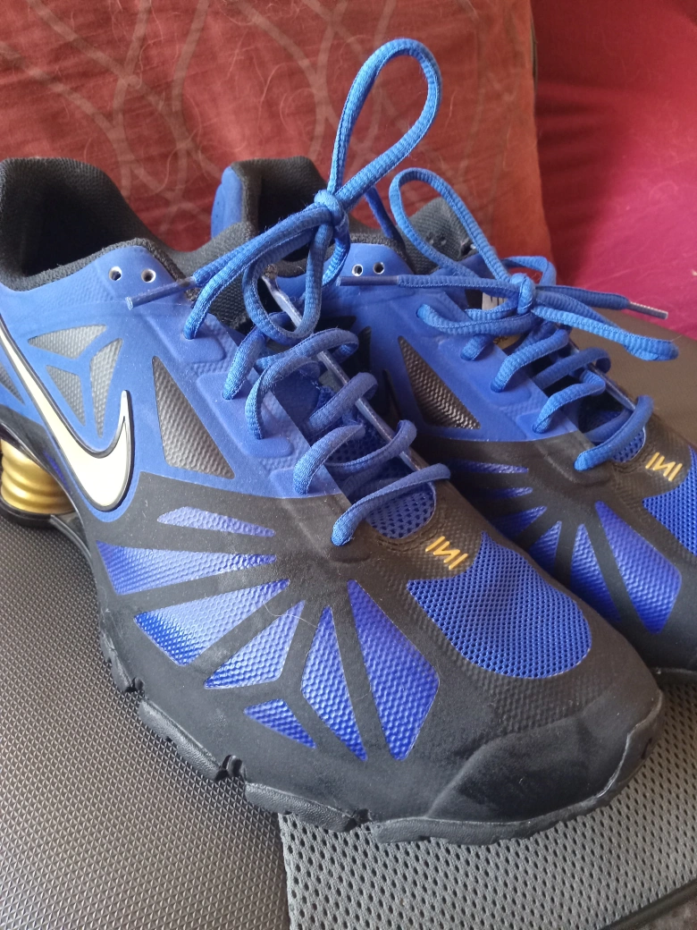 Selling a pair of Nike Shox running shoes in blue and black. These shoes feature the iconic Shox cushioning system for great comfort and support. They show some signs but are still in good condition for running or casual wear
