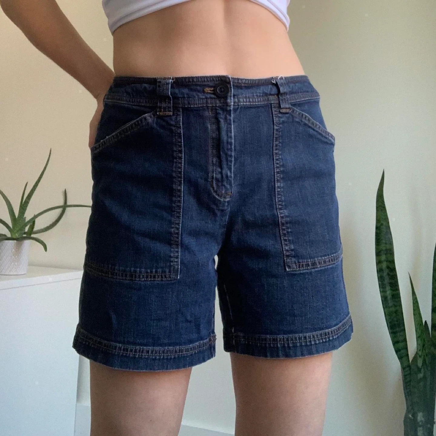 Dark wash denim, retro style, mid thigh, lightweight, deep pockets, 90s aesthetic, casual summer, vintage jeans, distressed denim, relaxed fit