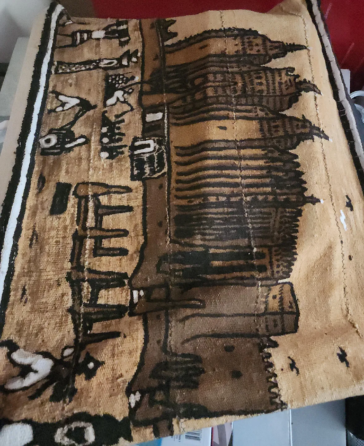 Selling this vintage wall hanging with an Egyptian-inspired design. It features a beige background with black and brown drawings. It's a unique piece to add some character to your home decor