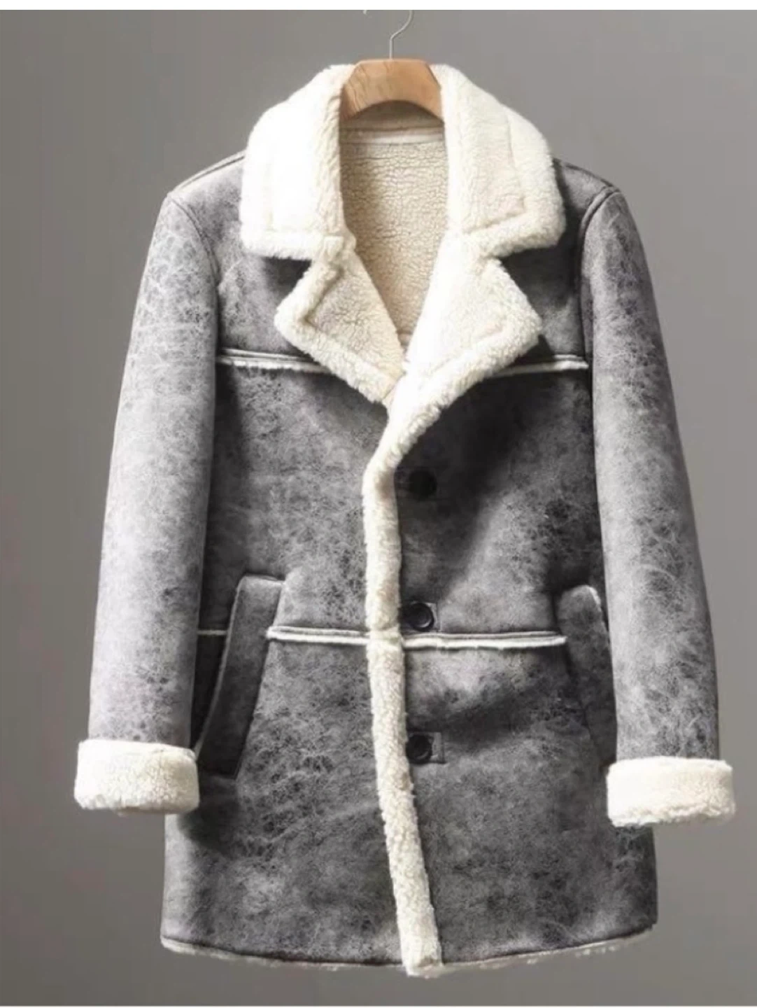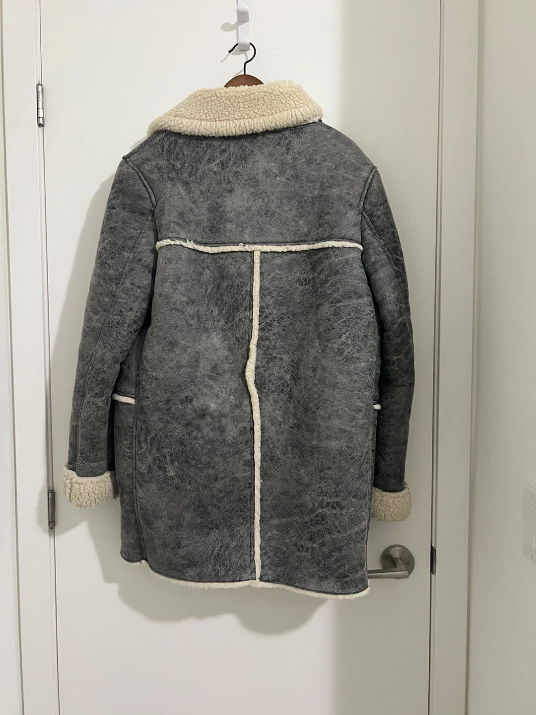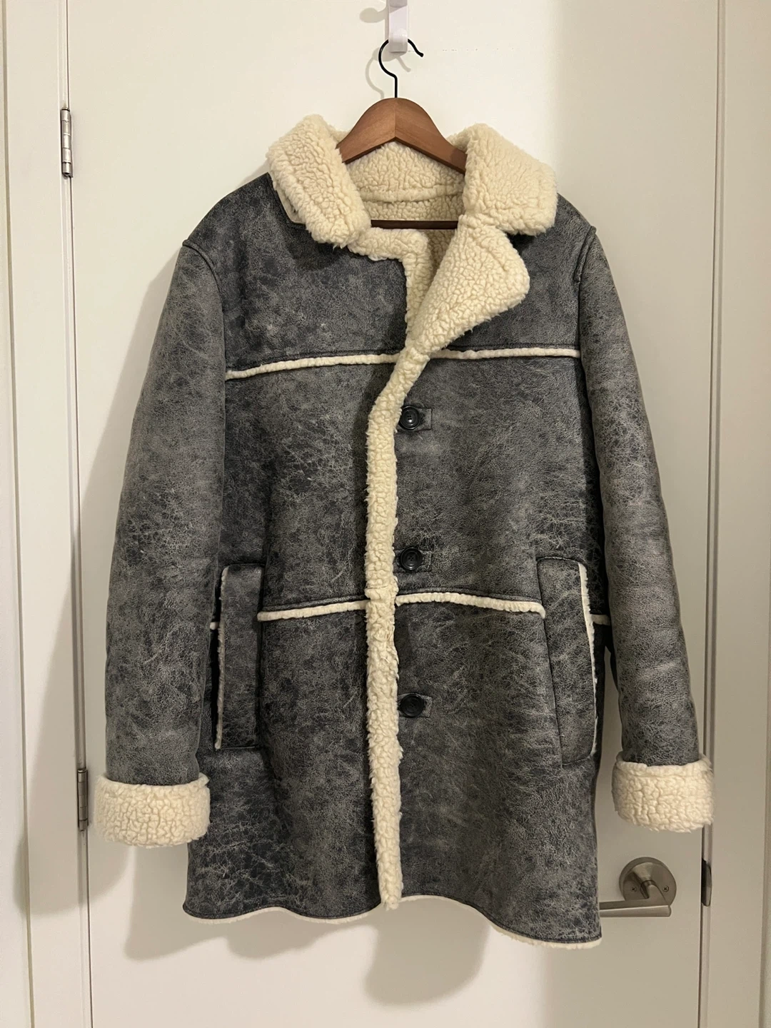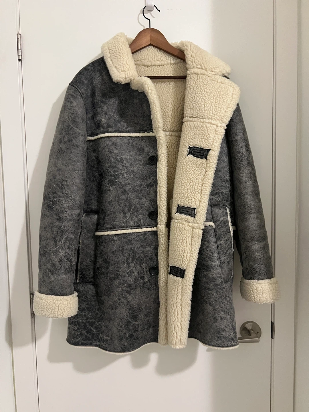 Selling a stylish grey coat with a shearling-style collar and trim. It's in great condition and ready to keep you warm this winter! The coat features a button-up front and a unique textured finish
