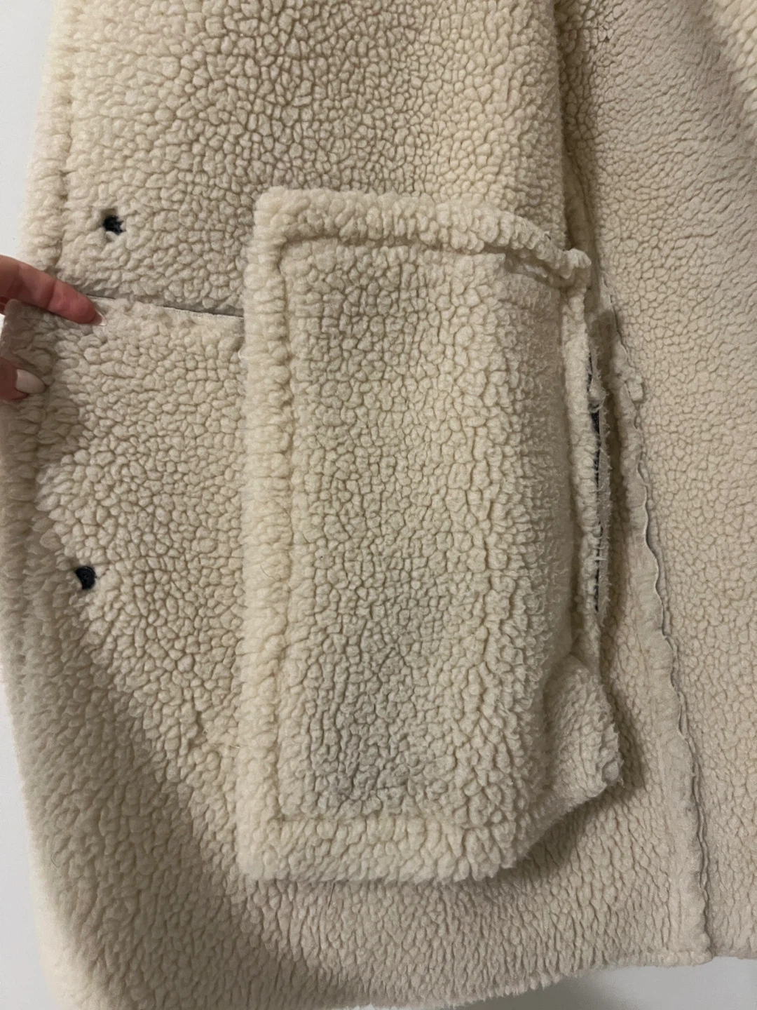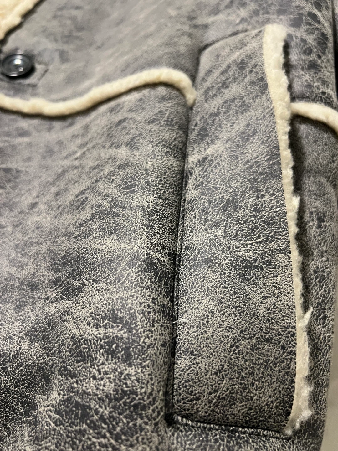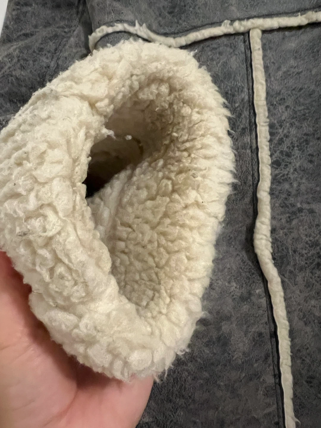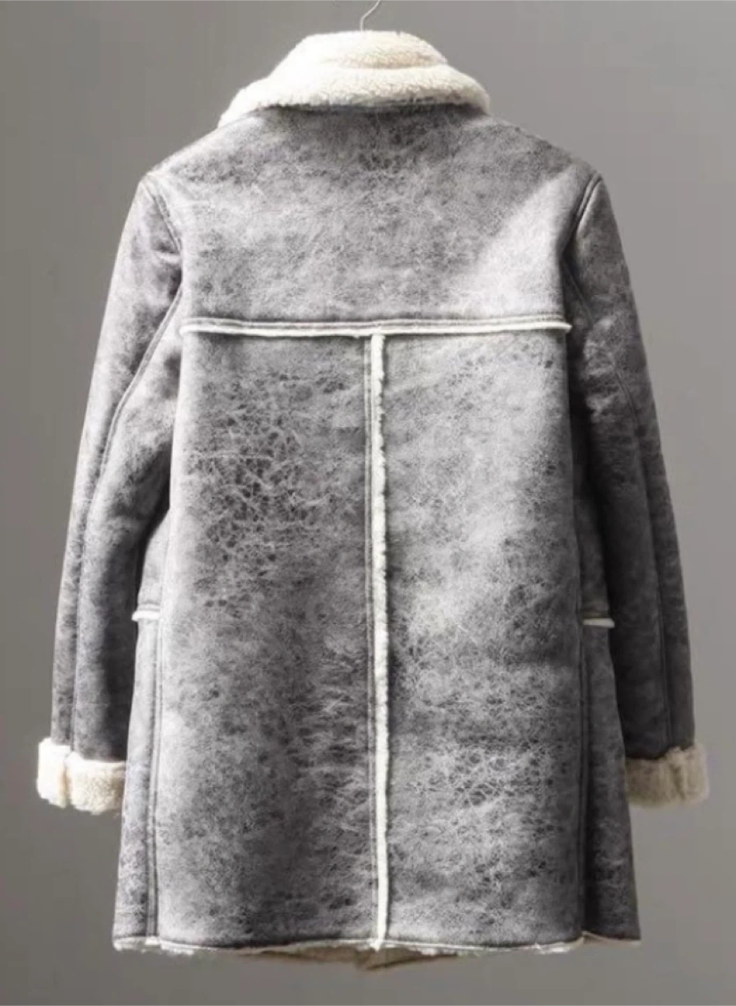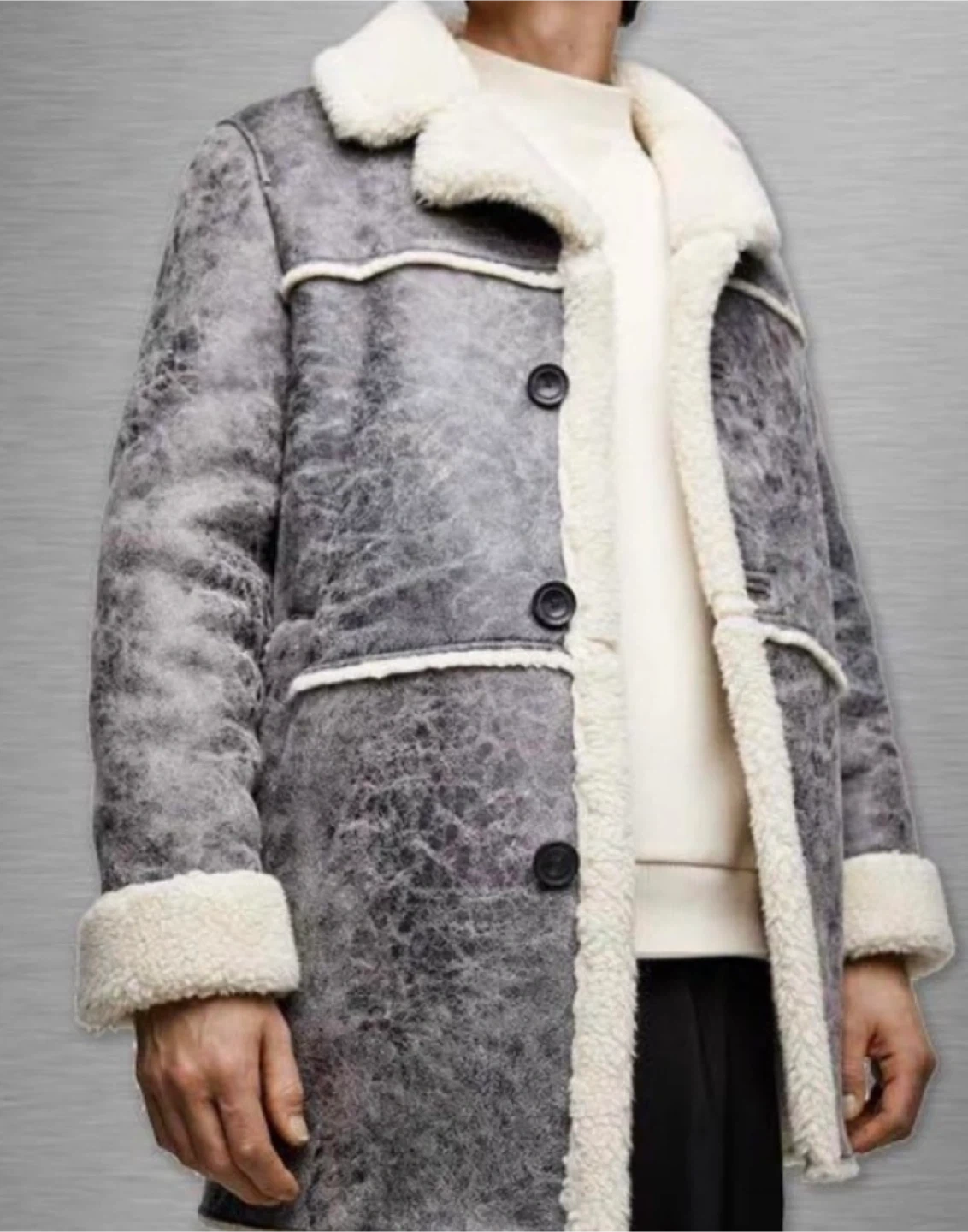 Selling a stylish grey coat with a shearling-style collar and trim. It's in great condition and ready to keep you warm this winter! The coat features a button-up front and a unique textured finish