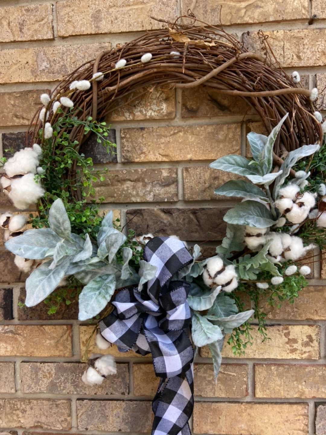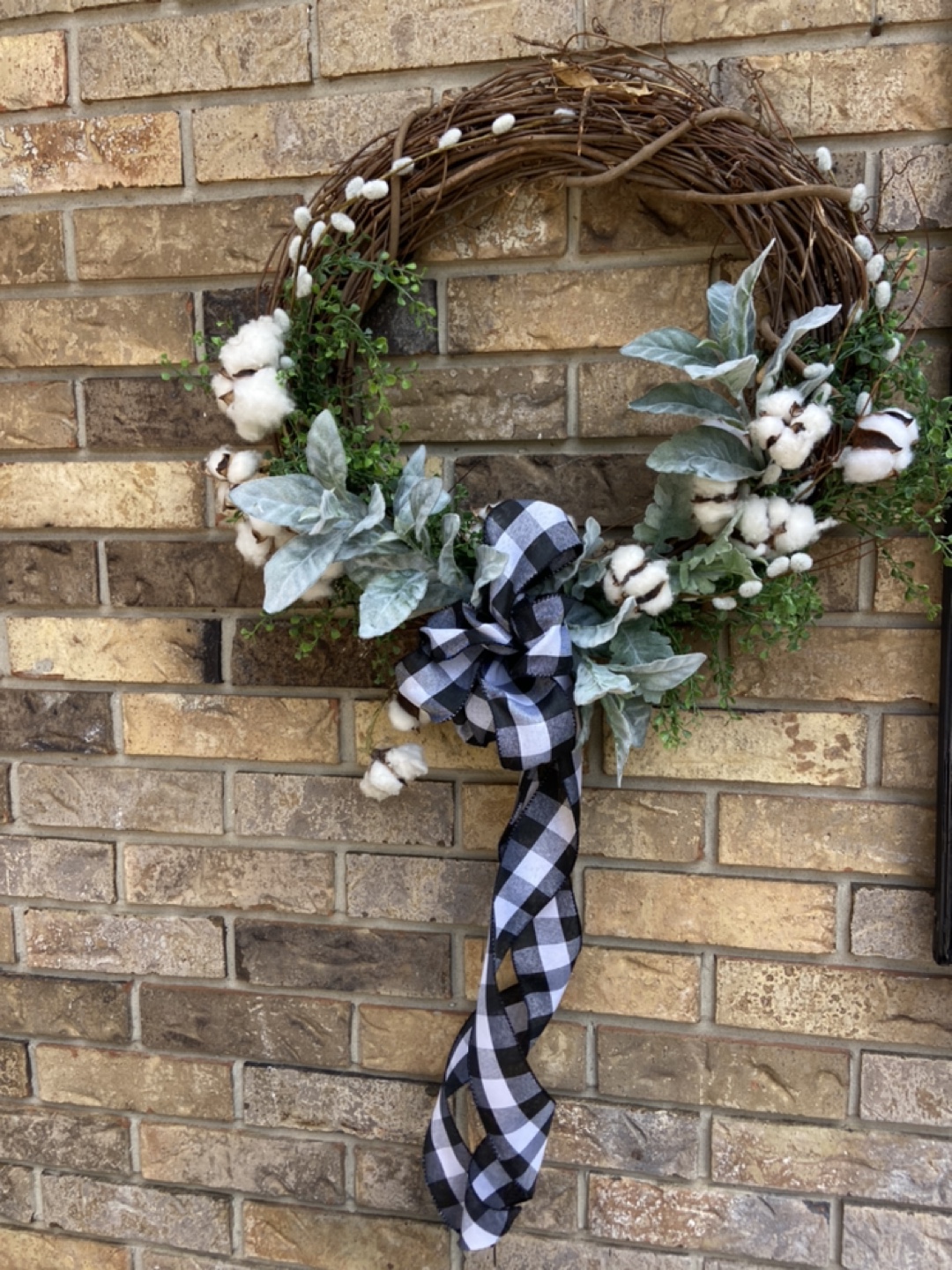 Selling a lovely handmade cotton wreath! It features a natural grapevine base adorned with faux cotton bolls, greenery, and a stylish black and white buffalo check ribbon.