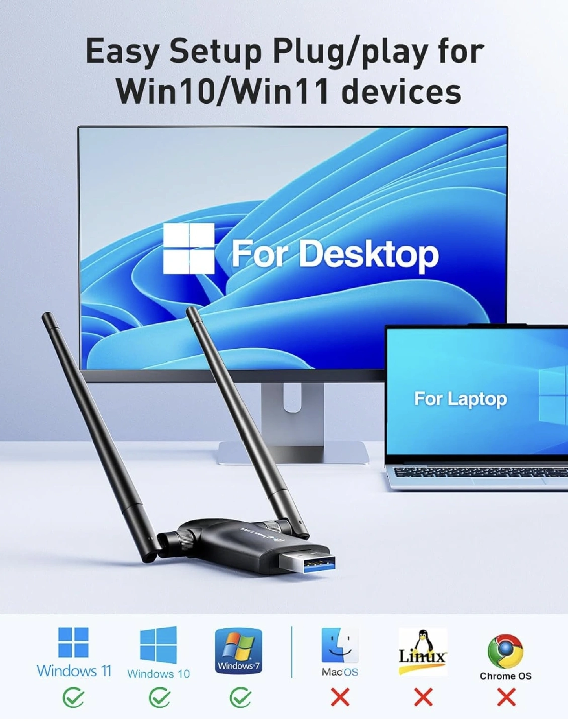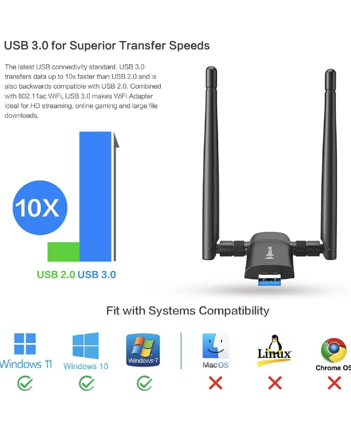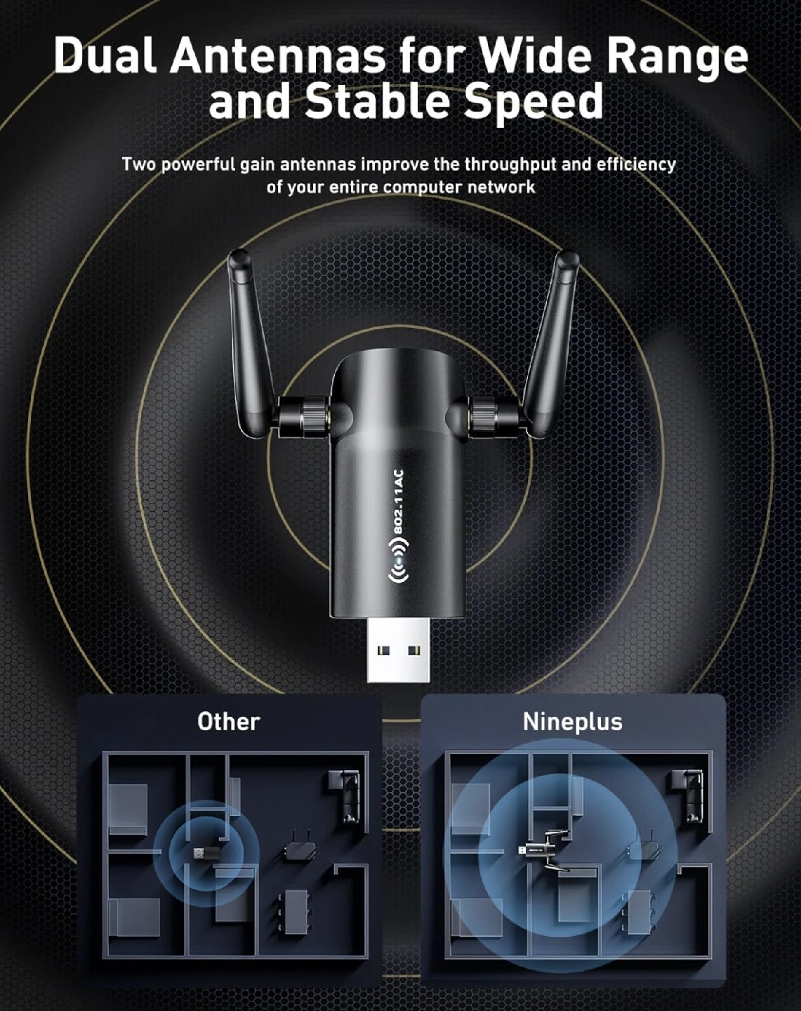 This Nineplus wireless adapter is perfect for upgrading your computer's WiFi capabilities! It supports both 2.4G and 5.8G dual-band connections, offering a stable and fast wireless experience. The USB 3.0 interface ensures superior transfer speeds, and the dual antennas provide wide range and stable signal strength. It's easy to set up and compatible with Windows 7, 10, and 11.