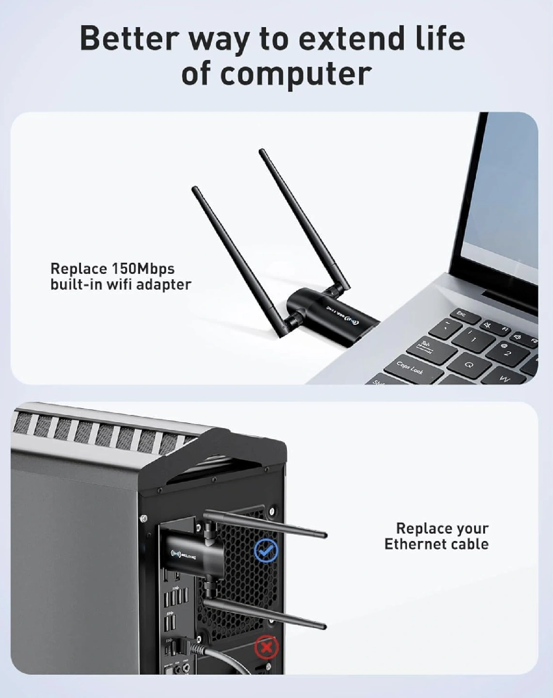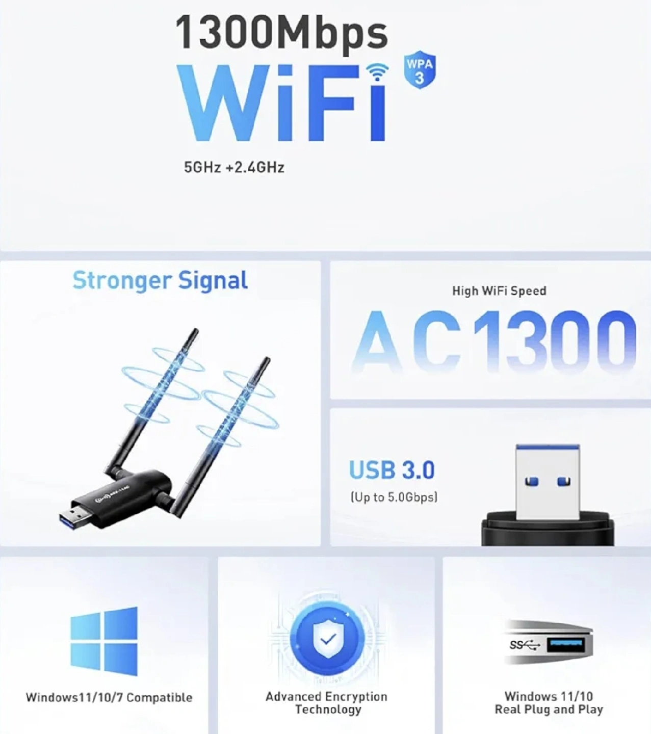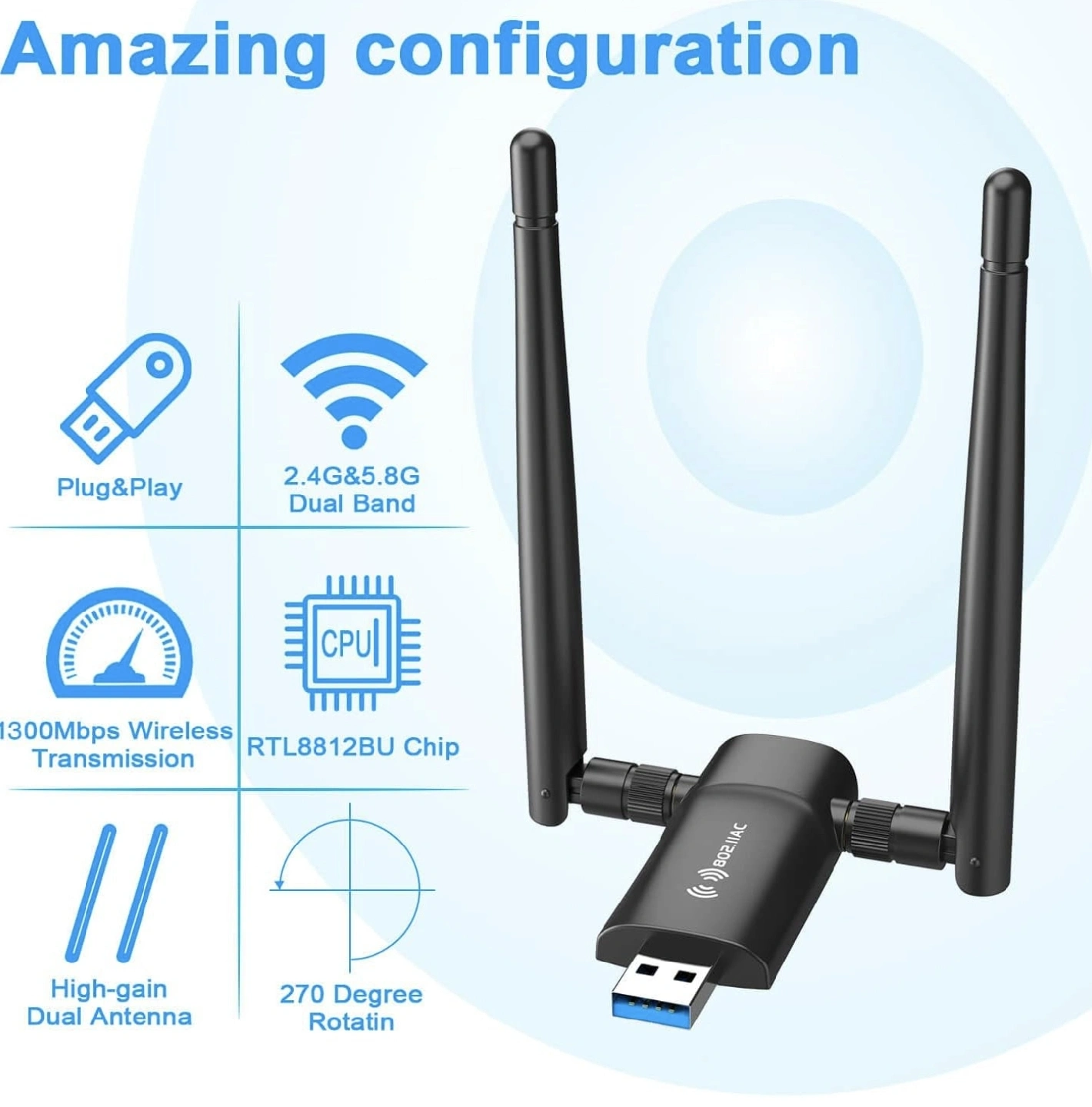 This Nineplus wireless adapter is perfect for upgrading your computer's WiFi capabilities! It supports both 2.4G and 5.8G dual-band connections, offering a stable and fast wireless experience. The USB 3.0 interface ensures superior transfer speeds, and the dual antennas provide wide range and stable signal strength. It's easy to set up and compatible with Windows 7, 10, and 11.