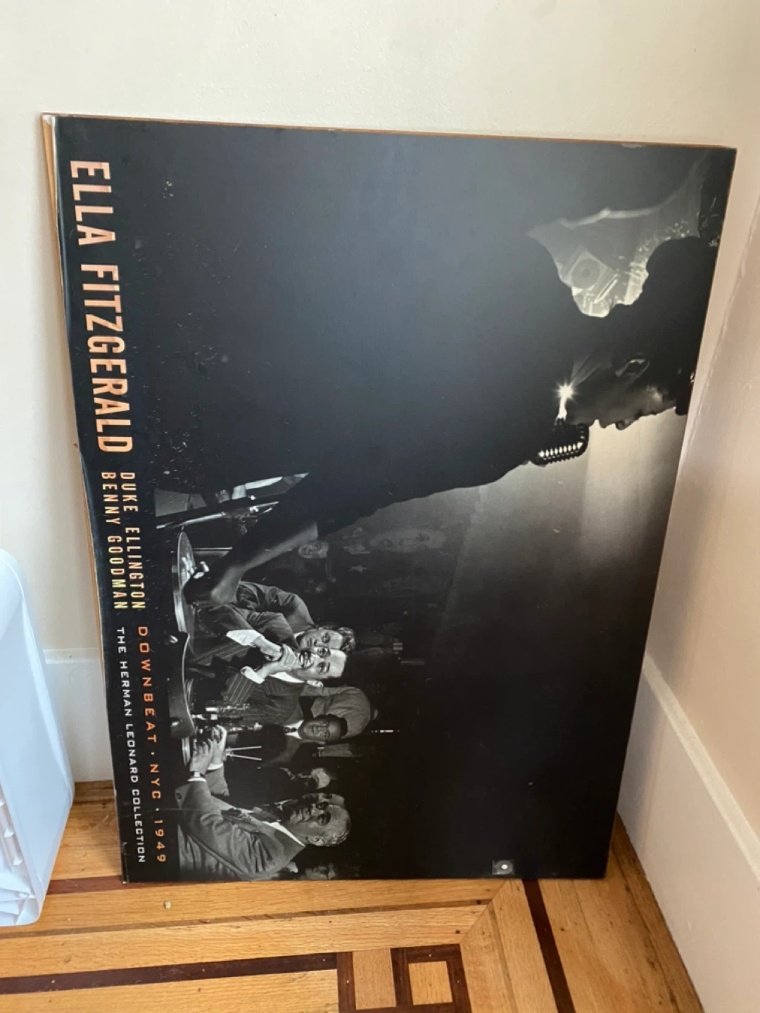 Selling a poster featuring Ella Fitzgerald, Duke Ellington, and Benny Goodman. It's from the Downbeat NYC 1949 Herman Leonard Collection. A great piece for any jazz enthusiast! Some rolling on the bottom.
