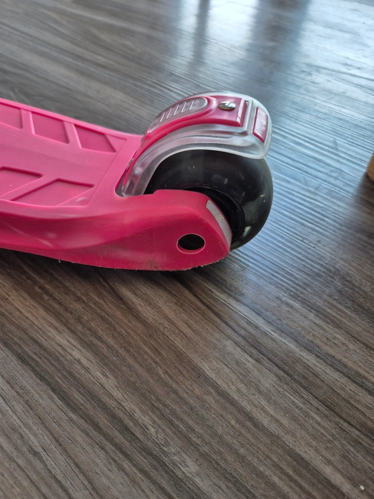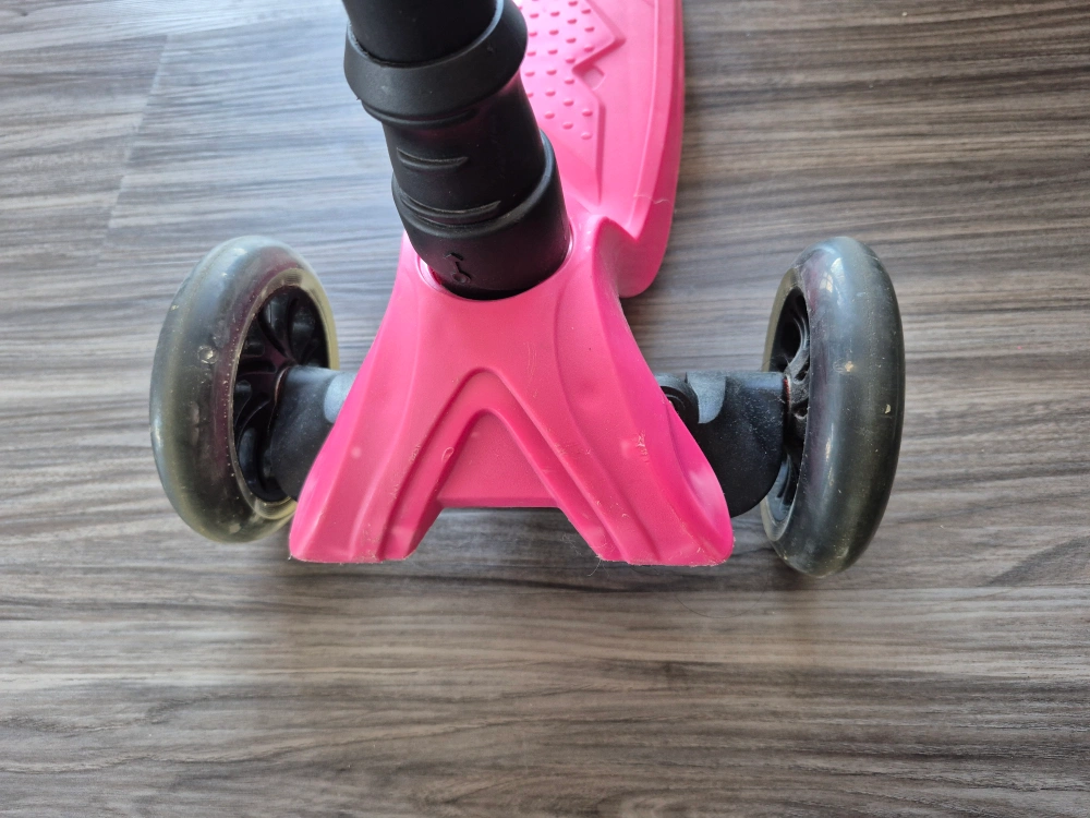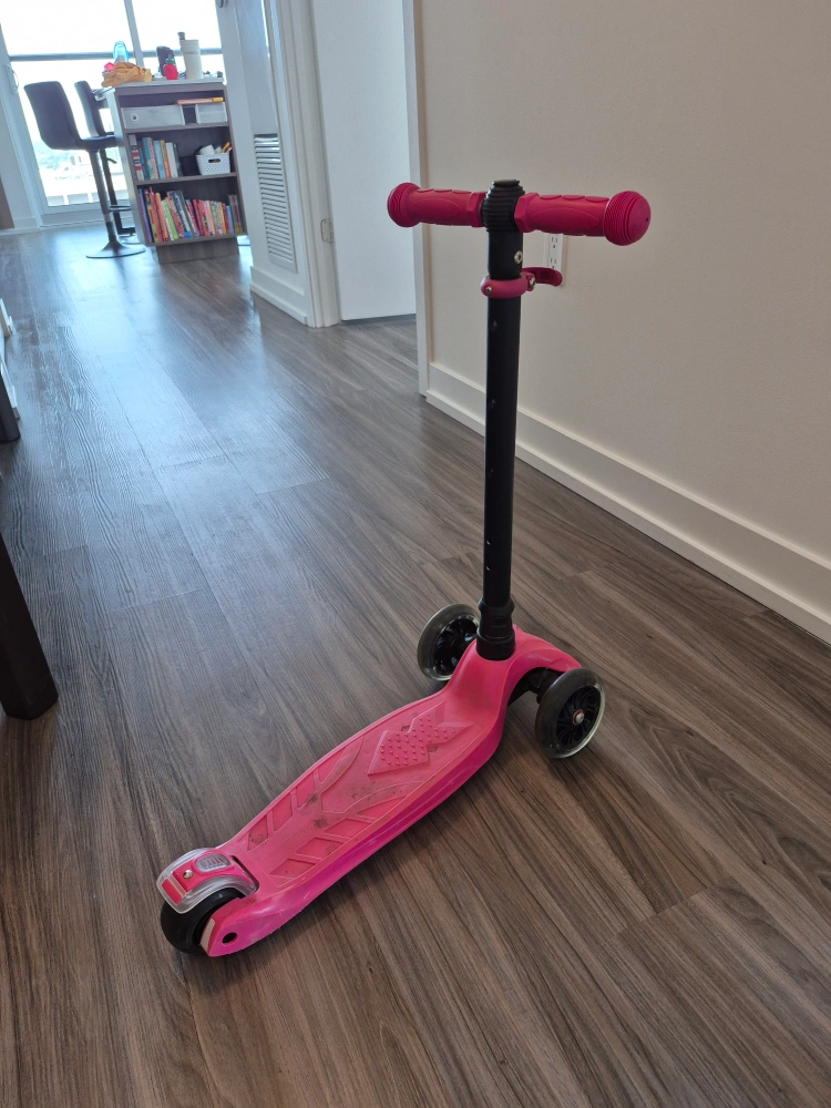 Selling a pink scooter for kids! Brand LaScoota It's in good condition and ready for a new home. The handle height is adjustable, and the picture shows it's lowest setting.