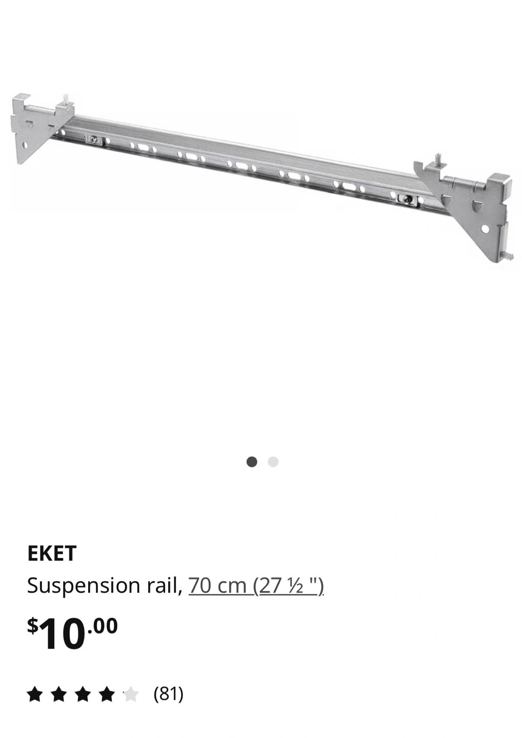 Selling a white Ikea Eket two door cabinet that comes with the suspension rail already attached to the back so it’s ready to be mounted if you’d like. The rail sits flush with the back which means it can also sit flat on the ground. We’ve been using it that way as you can see in the photo.