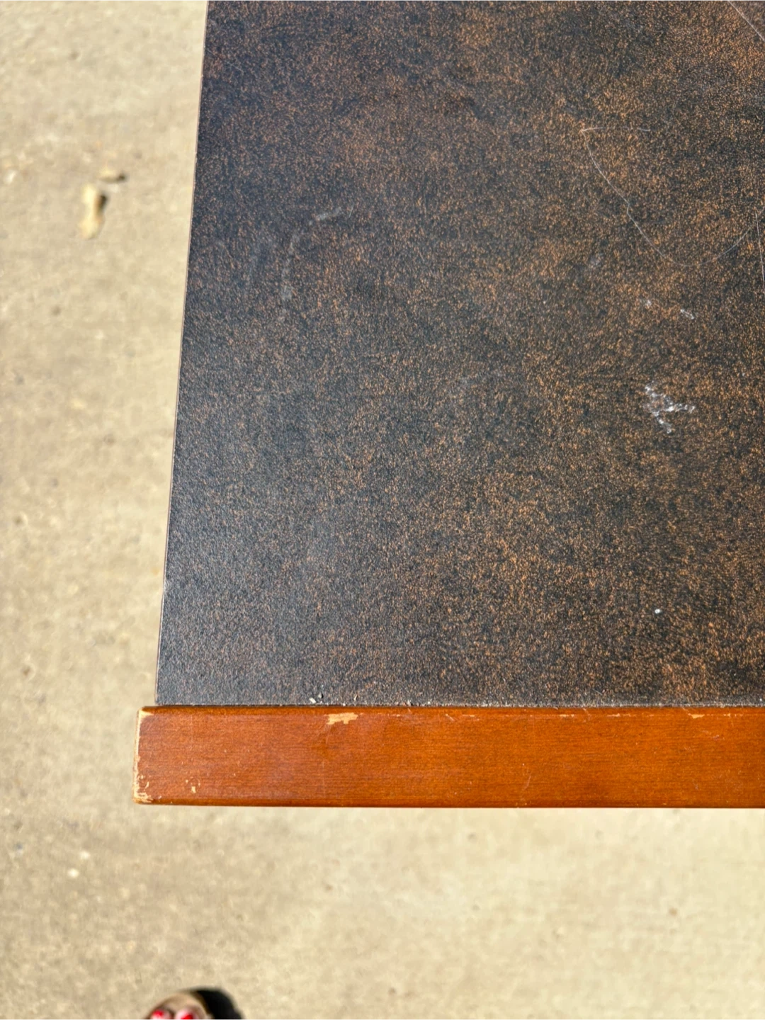Selling a vintage wood desk. It has a brown top and wood drawers on either side. It would be a great addition to your home office or study space. Comes with a good desk chair.