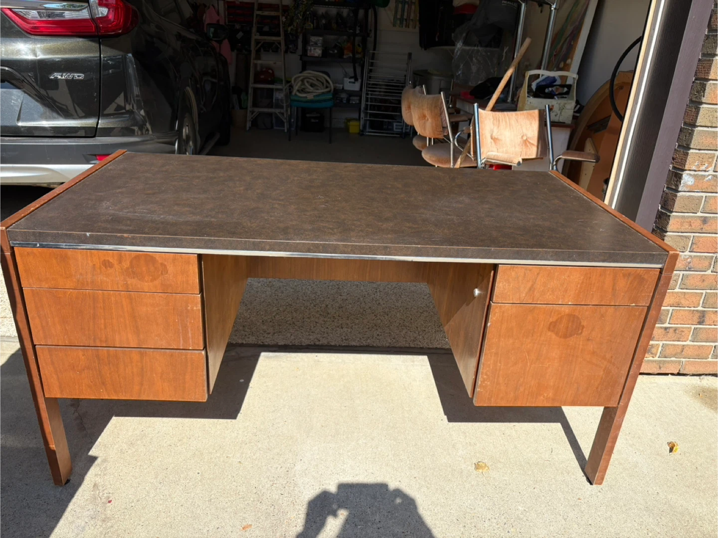 Selling a vintage wood desk. It has a brown top and wood drawers on either side. It would be a great addition to your home office or study space. Comes with a good desk chair.