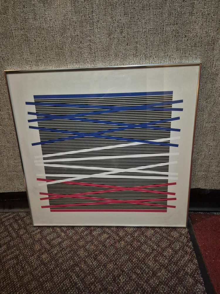Selling a framed abstract art print. It features a design with blue, white, black, and pink horizontal lines. The frame is silver. It's in good condition and ready to hang!