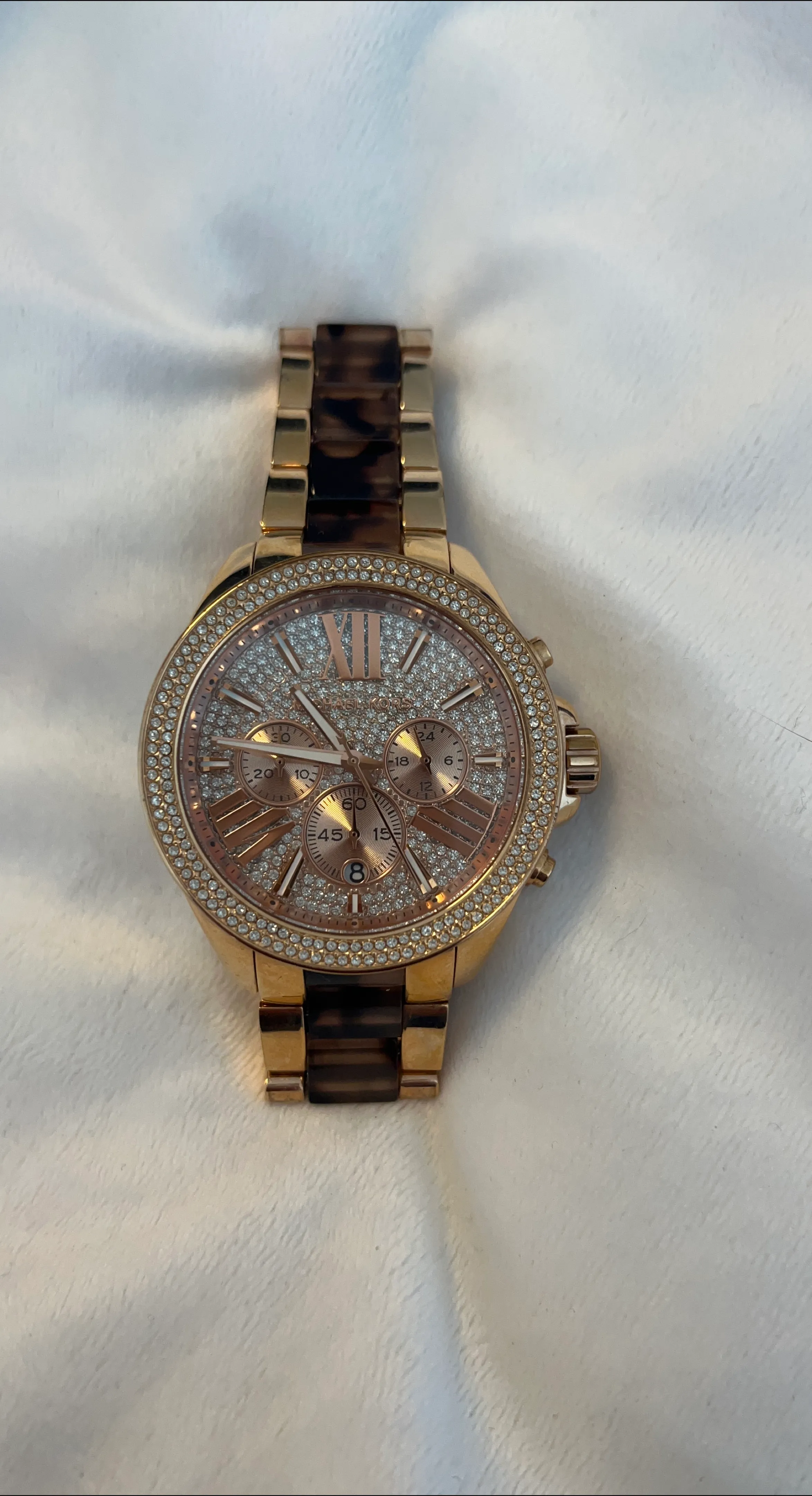 Selling a beautiful Michael Kors women's watch in gold and tortoise shell. It's in great condition and comes with the original box and extra links! The watch has a stunning crystal-accented dial that really catches the light. A stylish addition to any outfit!