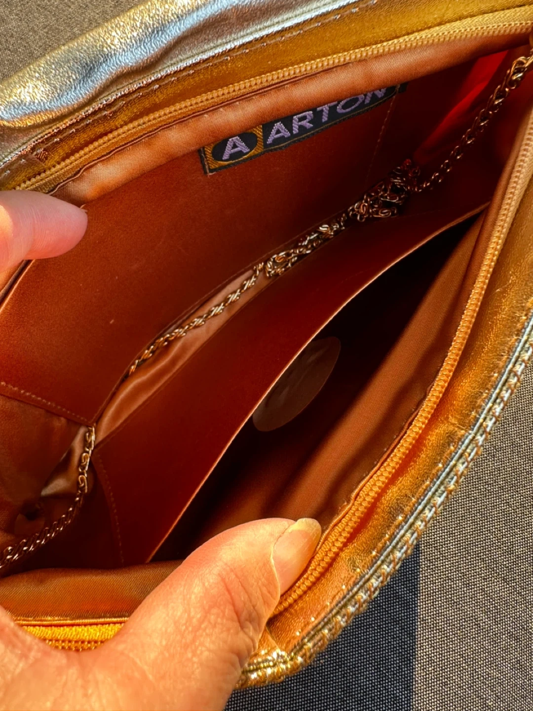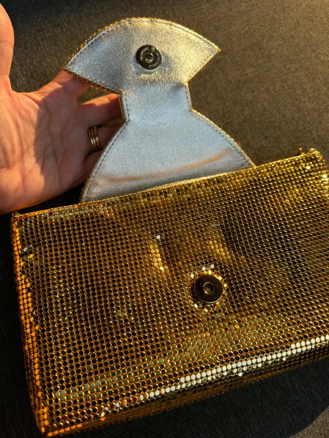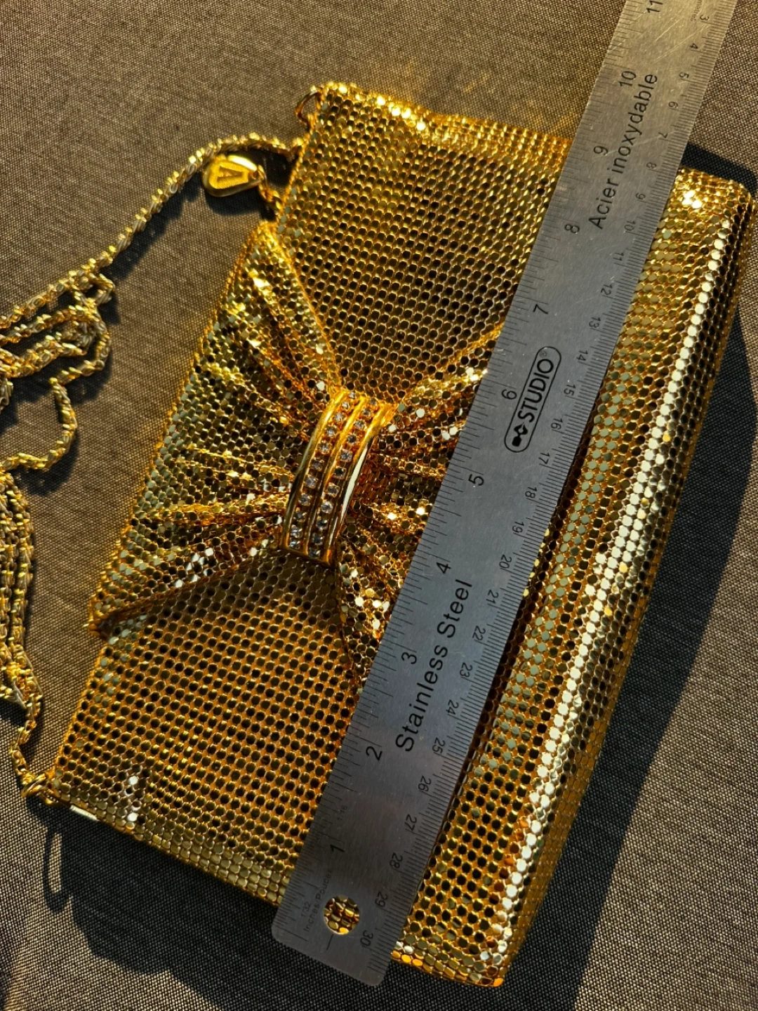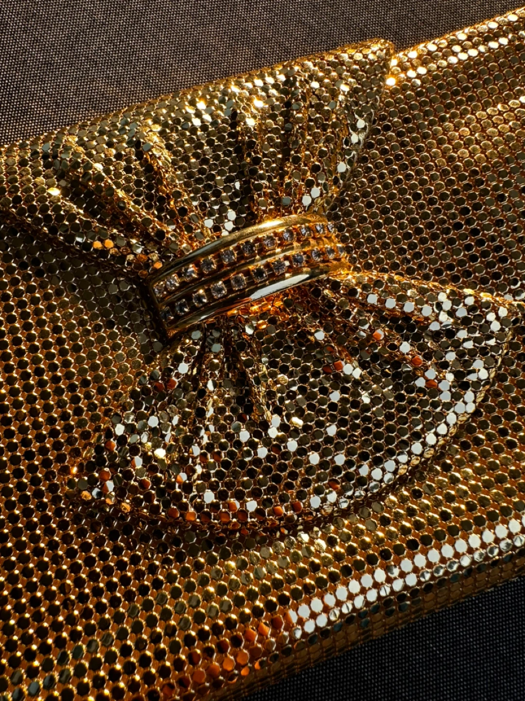 Gorgeous gold mesh clutch! It has a lovely bow detail on the front and a cute 'A' charm on the zipper. Perfect for a night out or special occasion. It's in great condition and ready for a new owner!