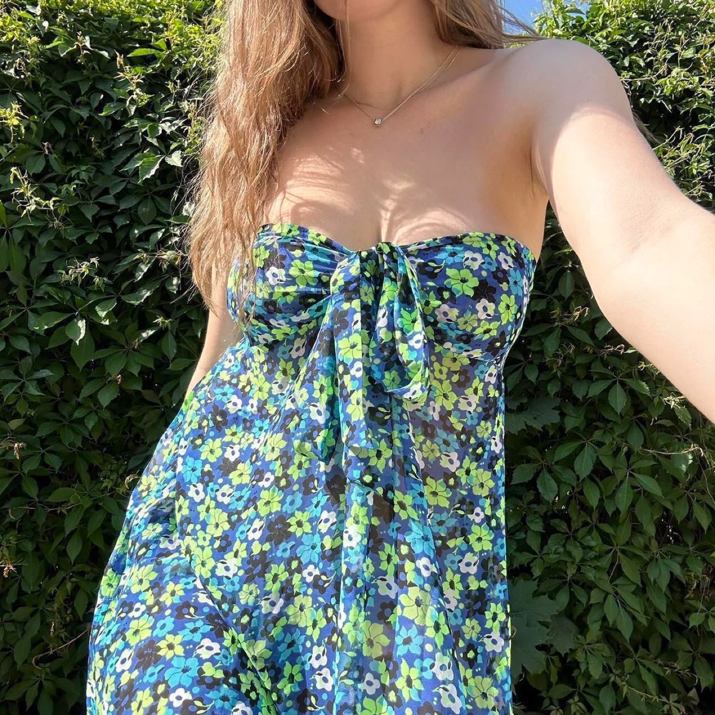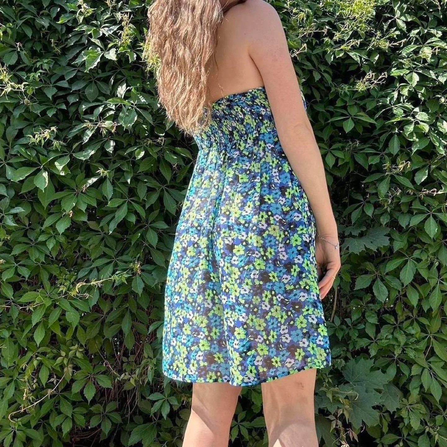 Y2k green and blue floral strapless mini dress