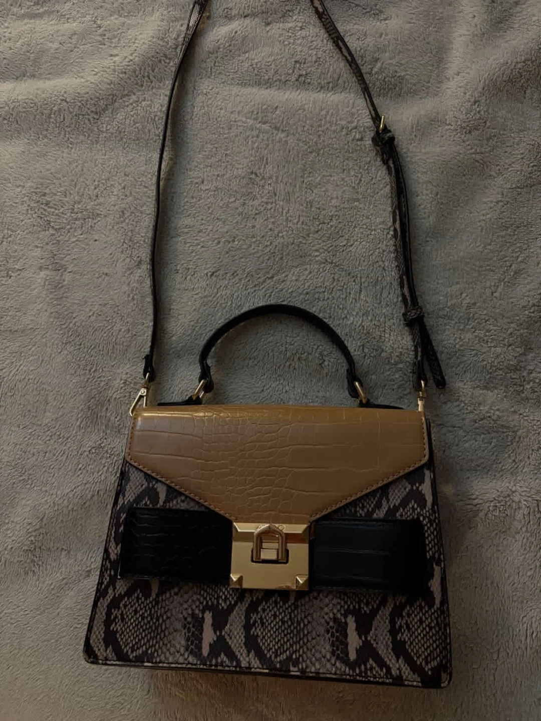 82Stylish Aldo crossbody bag with a unique snakeskin print! It features a structured design with a top handle and an adjustable shoulder strap. The bag has a mix of textures, including snakeskin, faux crocodile, and smooth black panels, making it a versatile accessory for any outfit