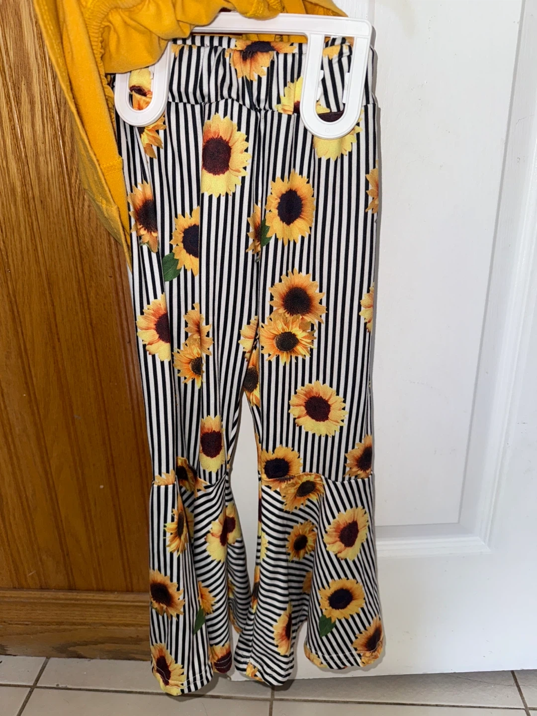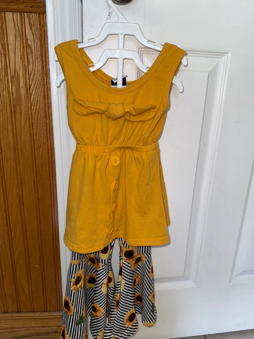 Super cute girls outfit featuring a bright yellow top with a sweet bow detail and matching pants with a fun sunflower and stripe pattern! Perfect for your little one's wardrobe