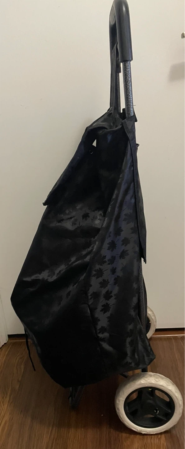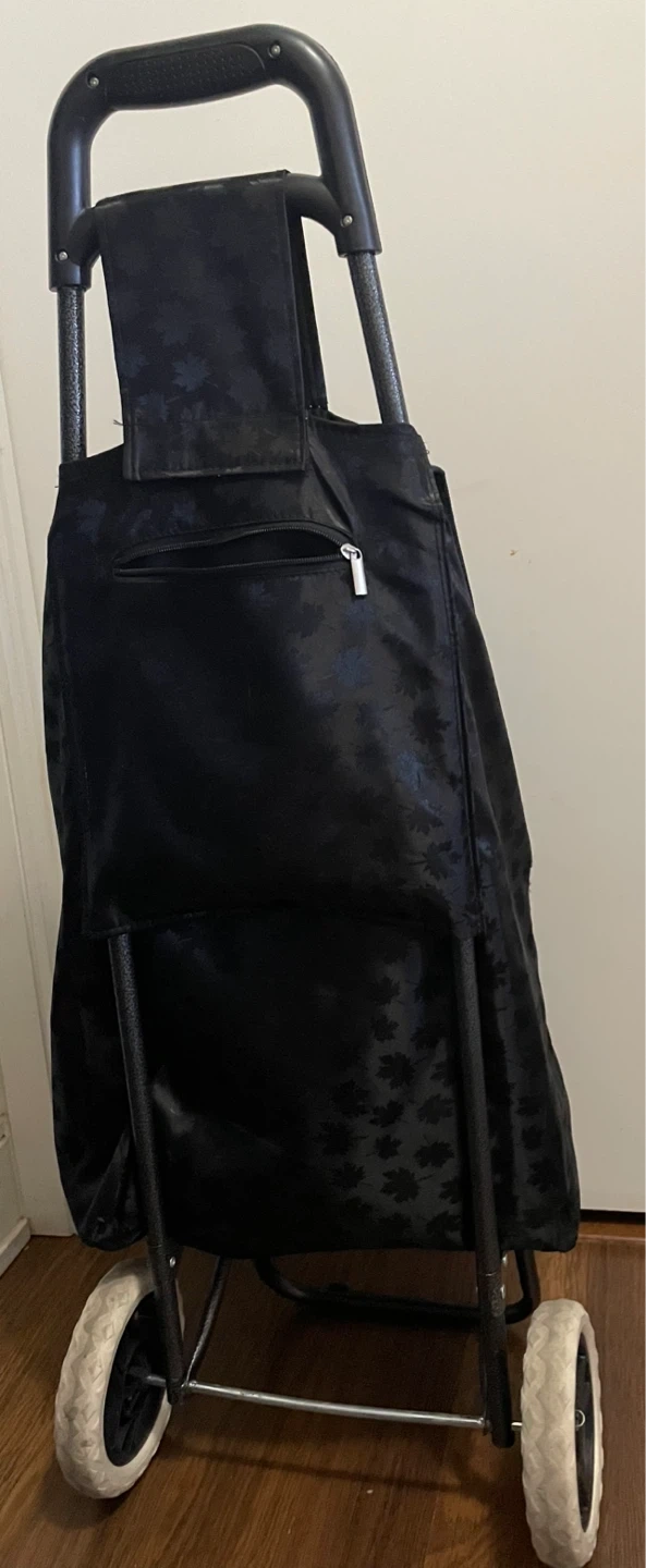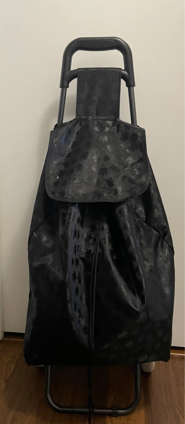 This is a black shopping cart with wheels, perfect for groceries or carrying items around town. It features a black material with a subtle leaf pattern. It has a drawstring closure and a zippered pocket for extra storage. The wheels make it easy to maneuver, even when it's full