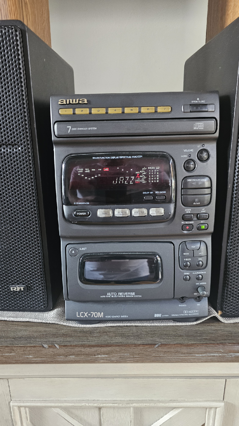 Selling an Aiwa LCX-70M micro compact system. It features a 7 disc changer system and an auto reverse auto tape select/bias sensor system. Comes with Infinity speakers to complete the audio experience! Perfect for enjoying your favourite tunes. Remote for stereo is included and new surrounds for Infinity speakers.