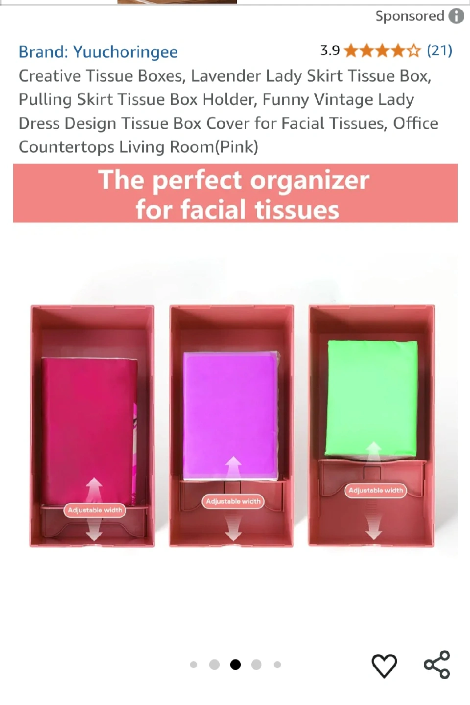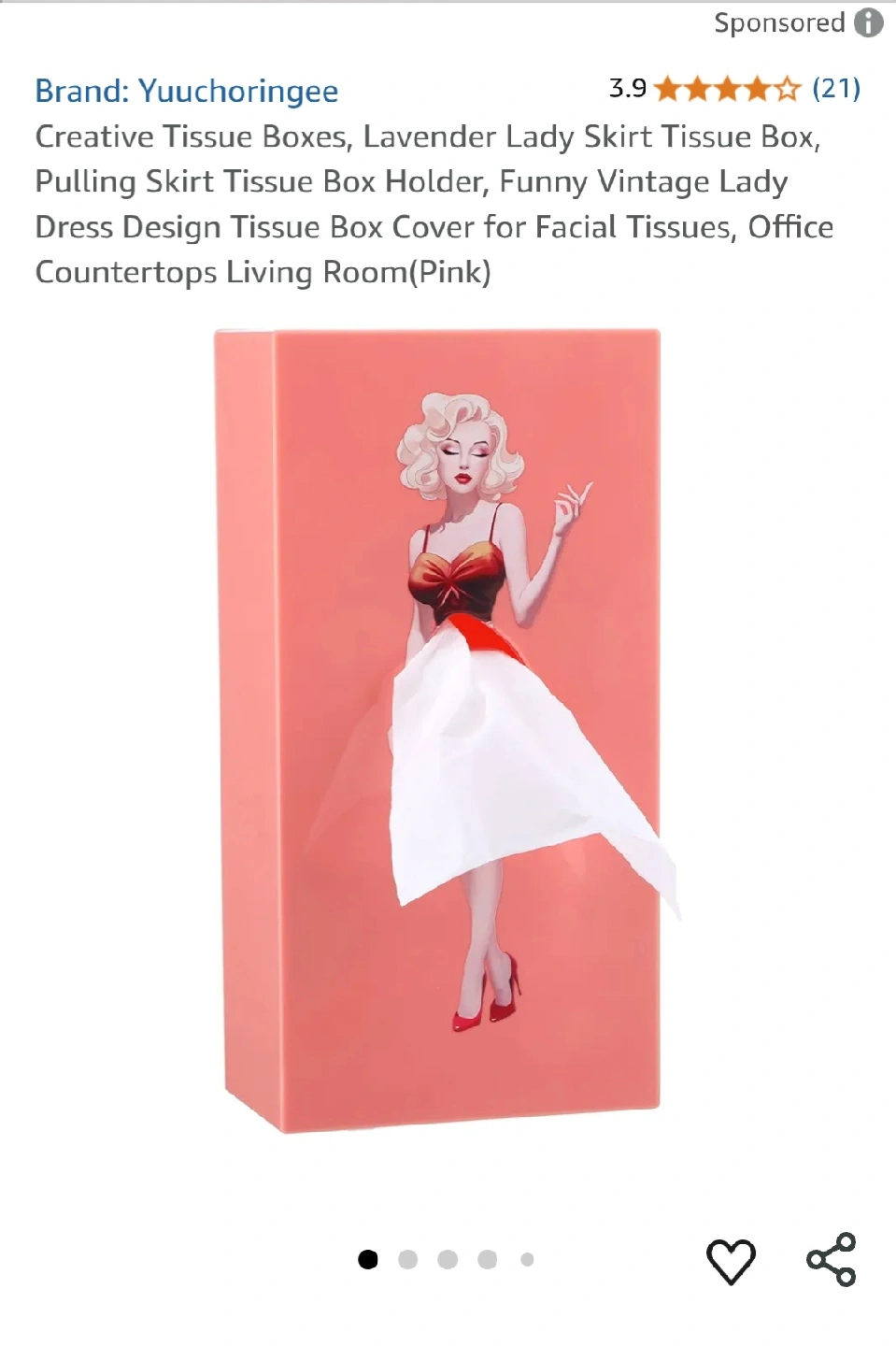 This Yuuchoringee tissue box features a cute Lavender Lady skirt design! It's in pink and measures 4.4 inches thick. It's a perfect organizer for facial tissues. The sliding baffle is compatible with over 901% of tissue sizes on the market, ensuring the tissue center aligns with the opening for smooth, consistent extraction. The detachable back cover makes it easy to replace tissues or clean the box, enhancing practicality while maintaining a sleek, attractive appearance