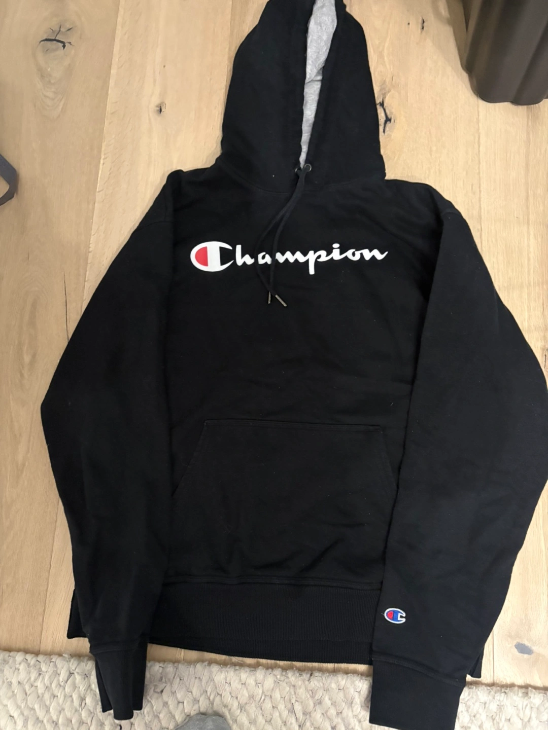 Selling a Champion hoodie in black. It's a size large and in good condition. The classic Champion logo is printed on the front. Perfect for staying cozy!