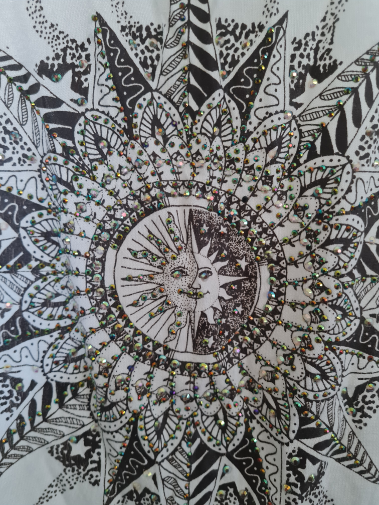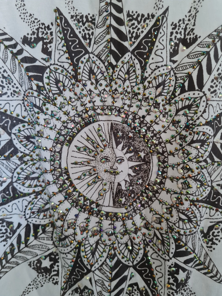 It's in great condition, only worn once, and ready for a new home. Features a bedazzled sun and moon graphic. Perfect for casual wear or layering.