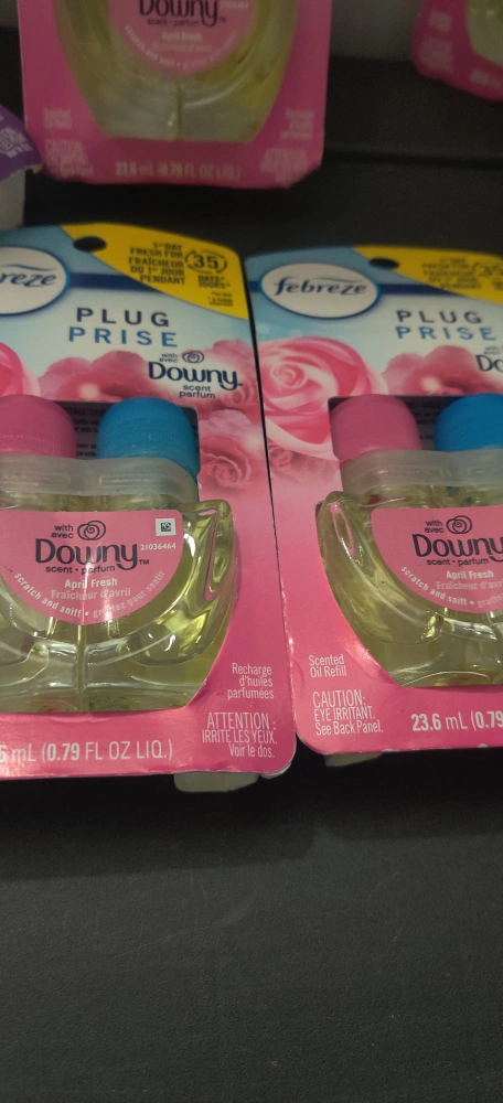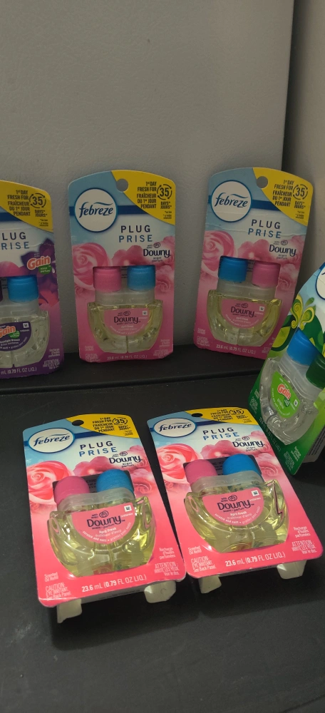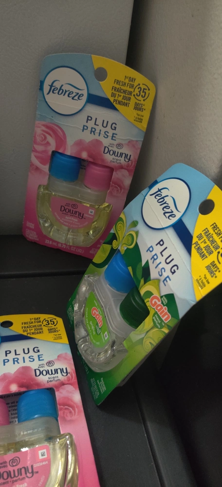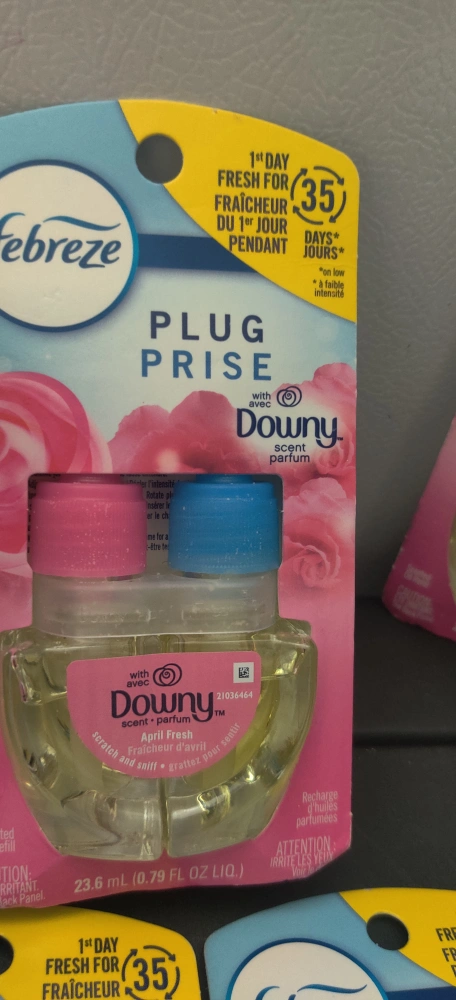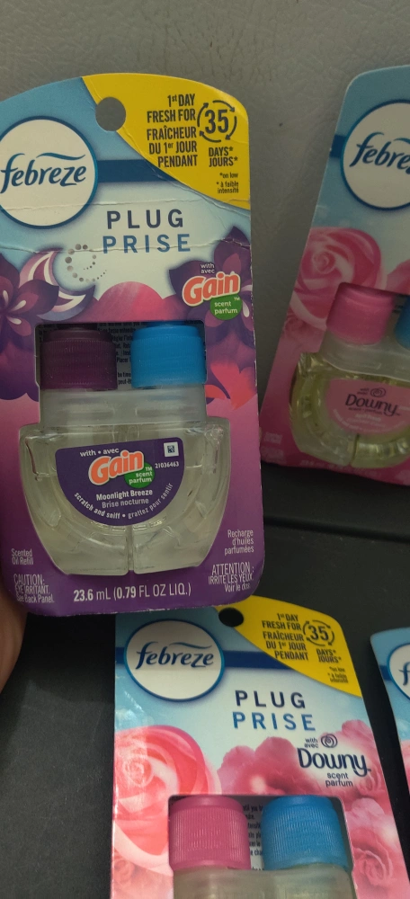 Selling 6 Febreze Plug Prise refills in Downy April Fresh and Gain Moonlight Breeze scents! These are scented oil refills, each 23.6 mL (0.79 FL OZ LIQ). Enjoy fresh fragrance for up to 35 days!. If you cannot pick up soon please do not ask to reserve