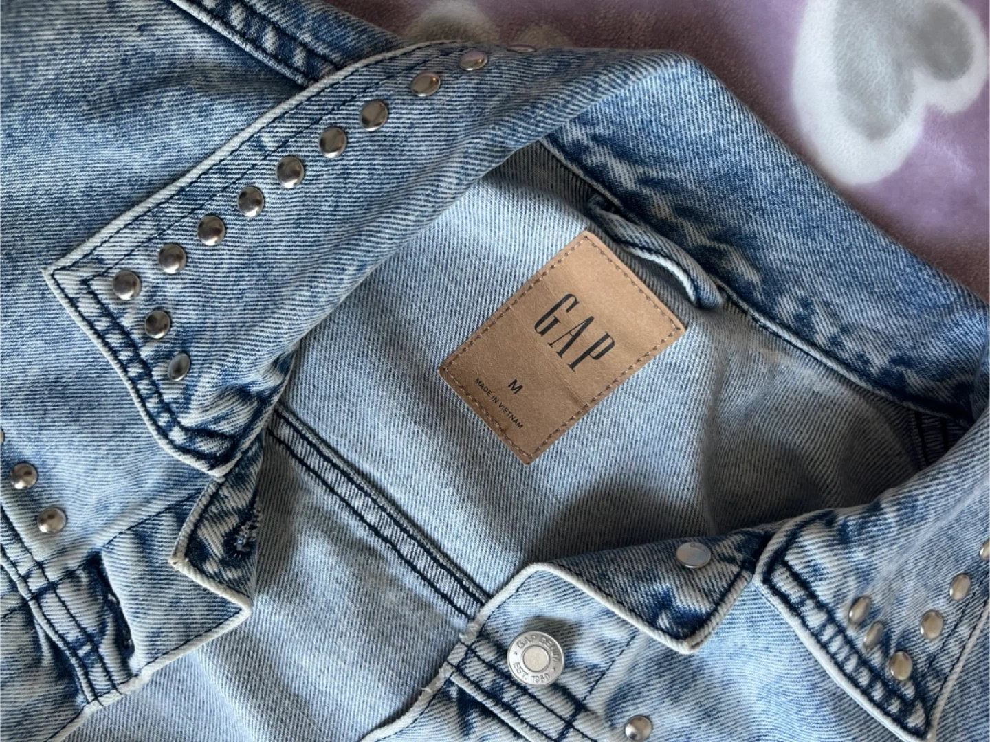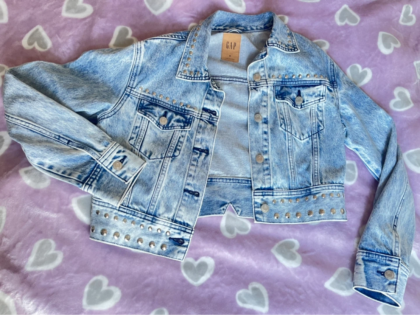 Selling a cute GAP denim jacket in size medium! It's a light wash denim with silver stud detailing. Perfect for layering or wearing on its own. In great condition!