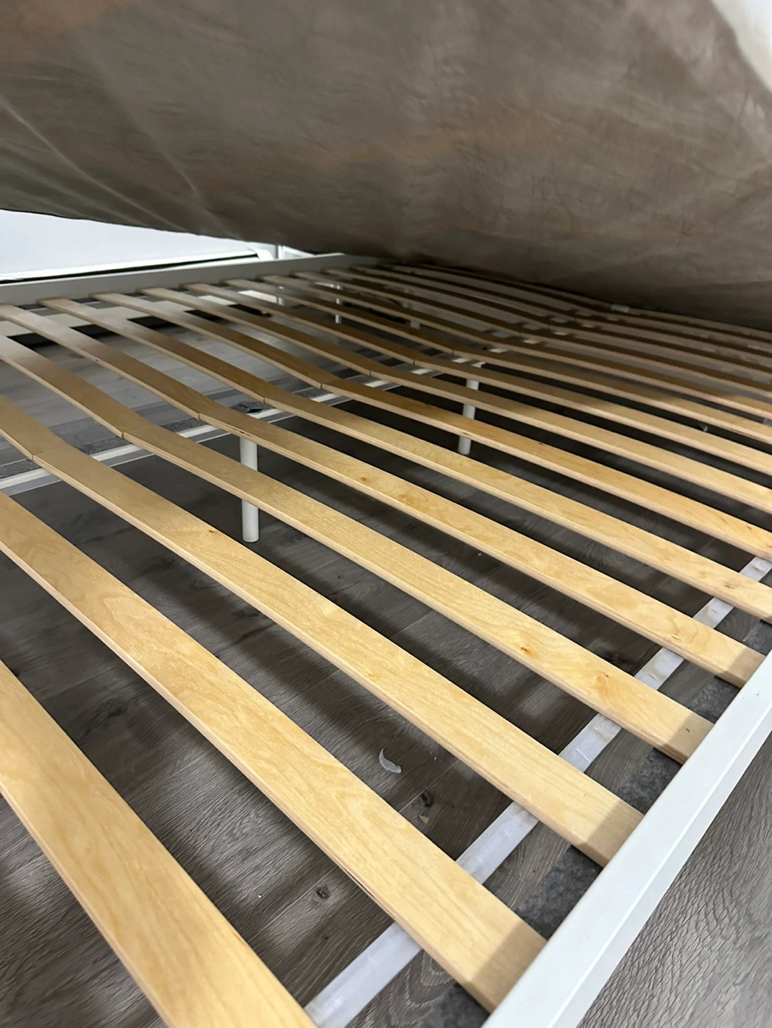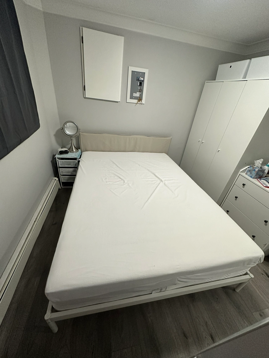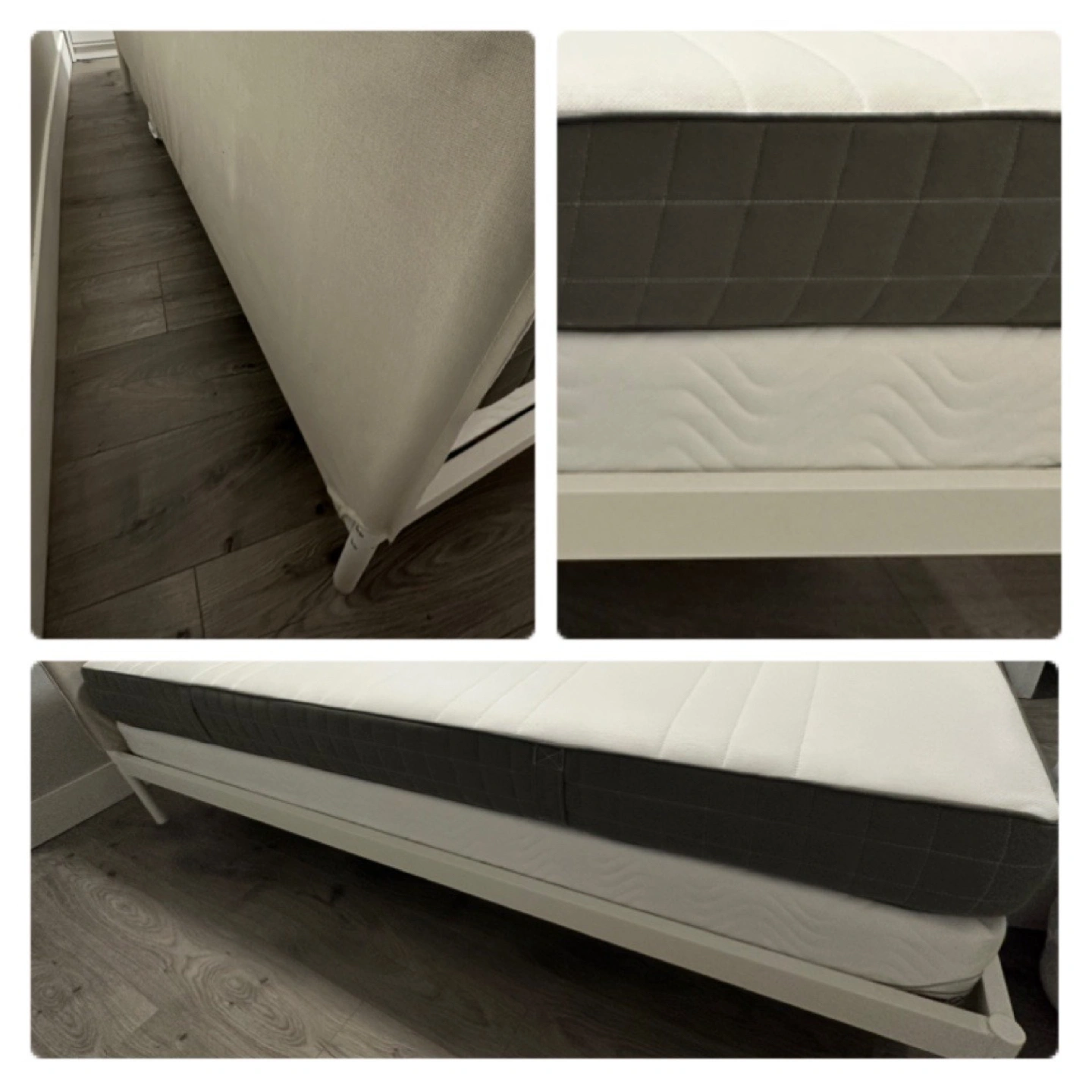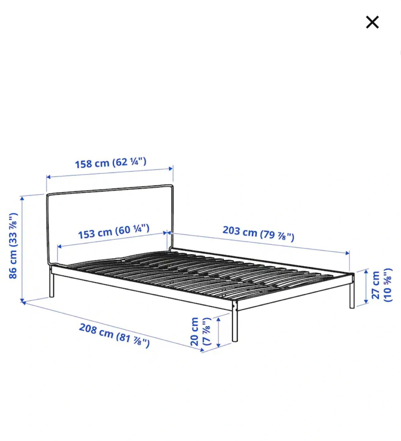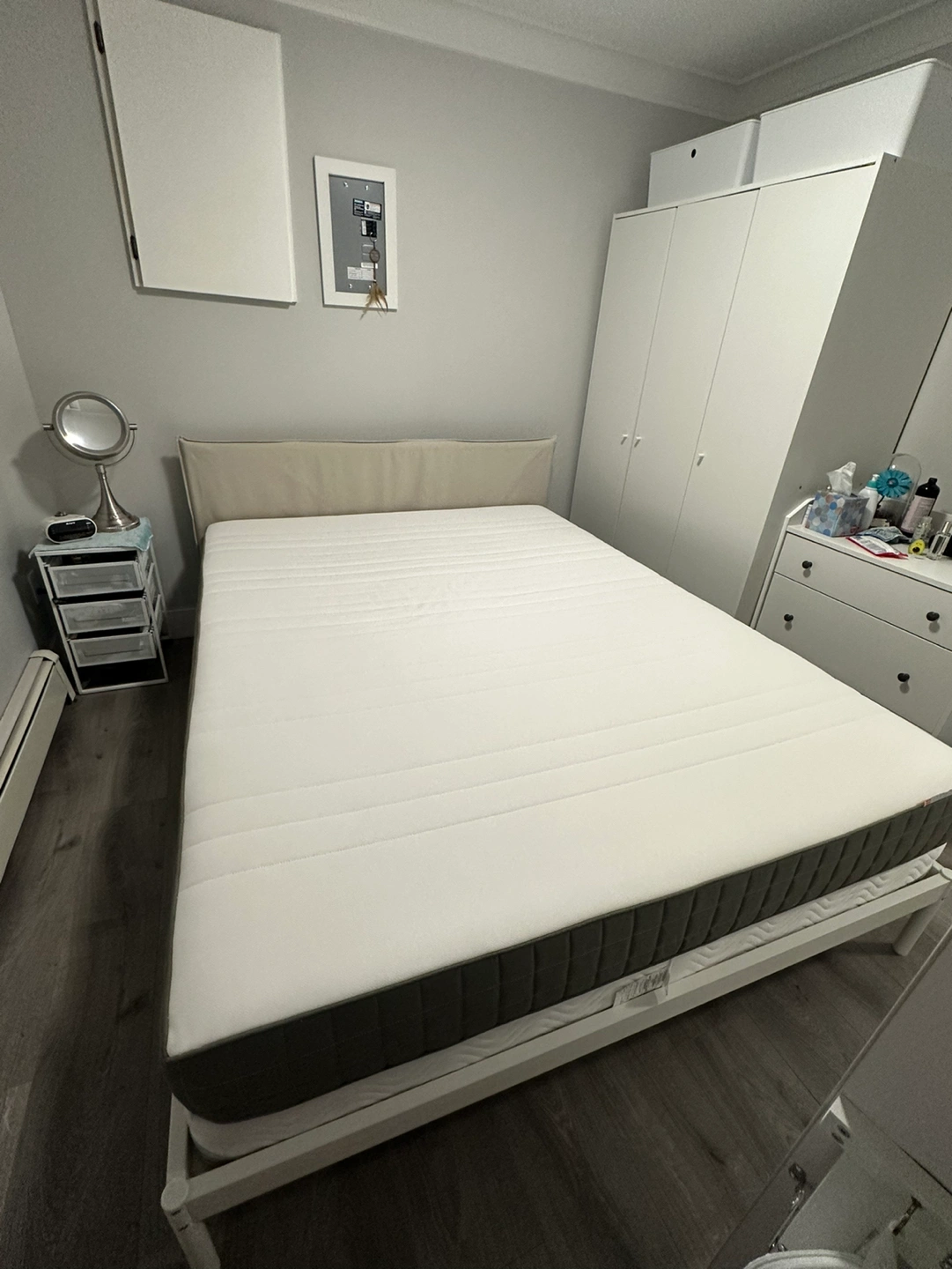 Ikea queen bed frame and mattress w/ waterproof fitted cover. Dimentions are in one of the photos.