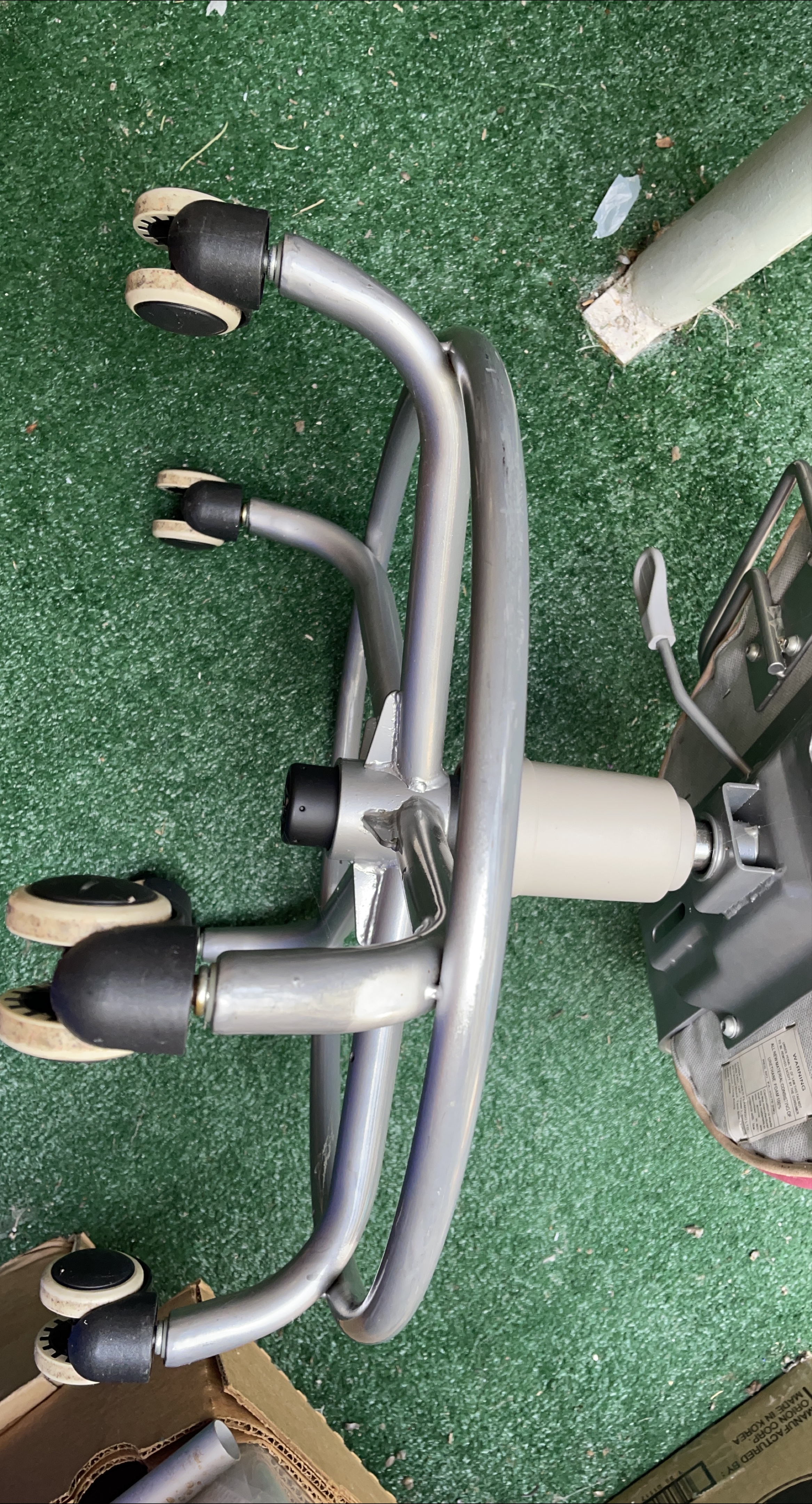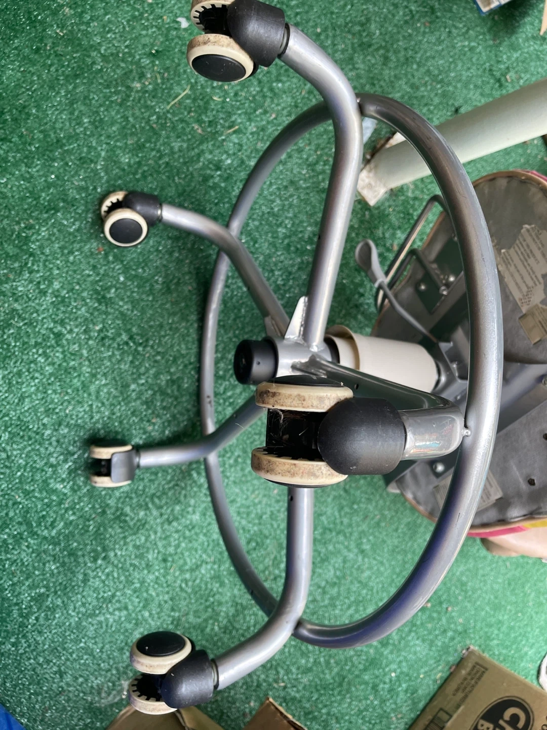 Free an office chair base with casters. It's in good condition and ready to be attached to a chair seat. Perfect for replacing a broken base or building your own custom office chair!