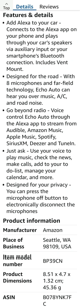 Add Alexa to your car with the Amazon Echo Auto! Connects to your phone and plays through your car's speakers via auxiliary input or Bluetooth. It includes a vent mount. Echo Auto can hear you over music, A/C, and road noise with 8 microphones and far-field technology. You can also electronically disconnect the microphones for privacy
