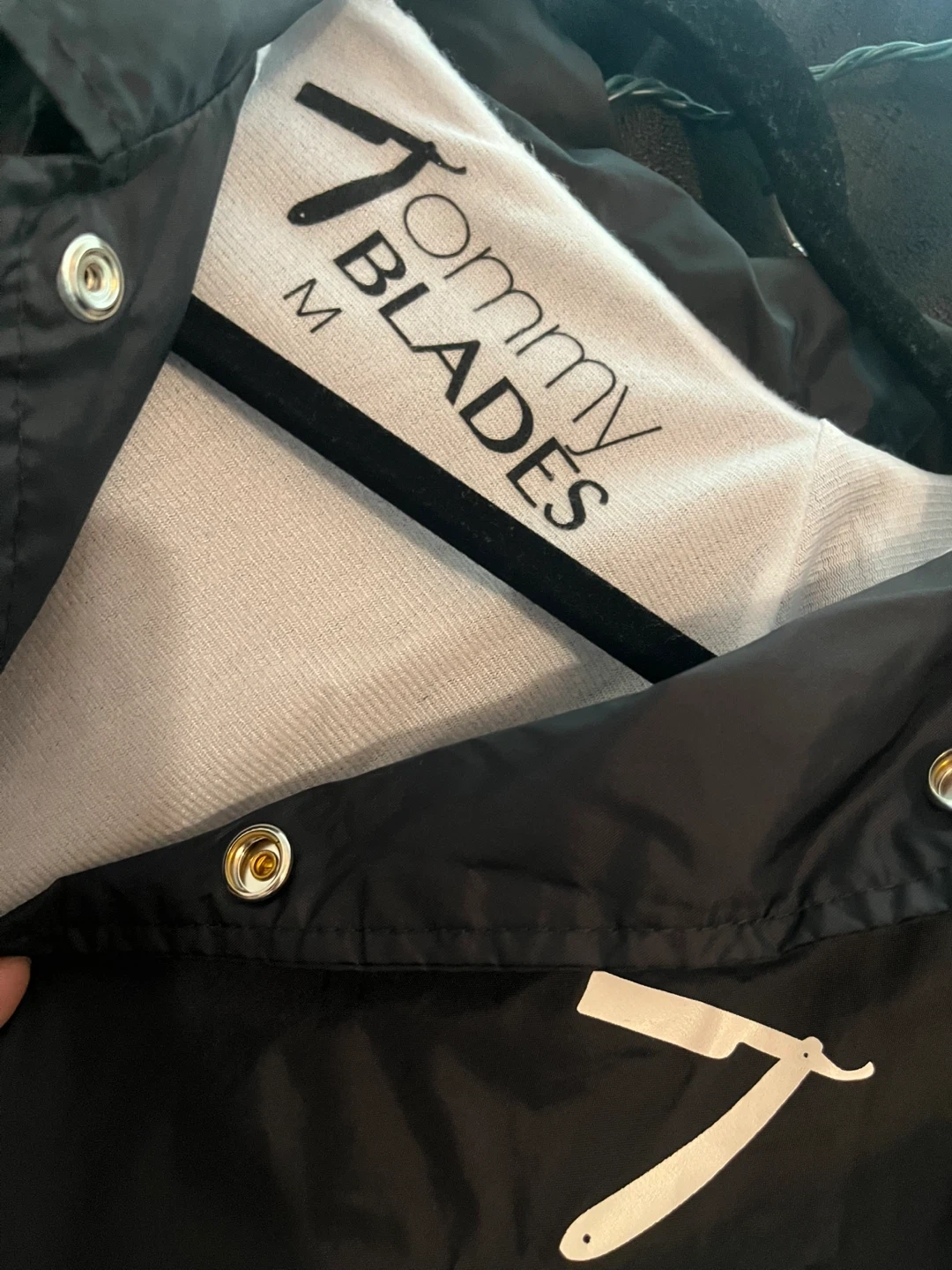 Tommy Blades jacket in size medium. It's black with 'Work Hard Dream Big' on the back, and the Tommy Blades logo on the front