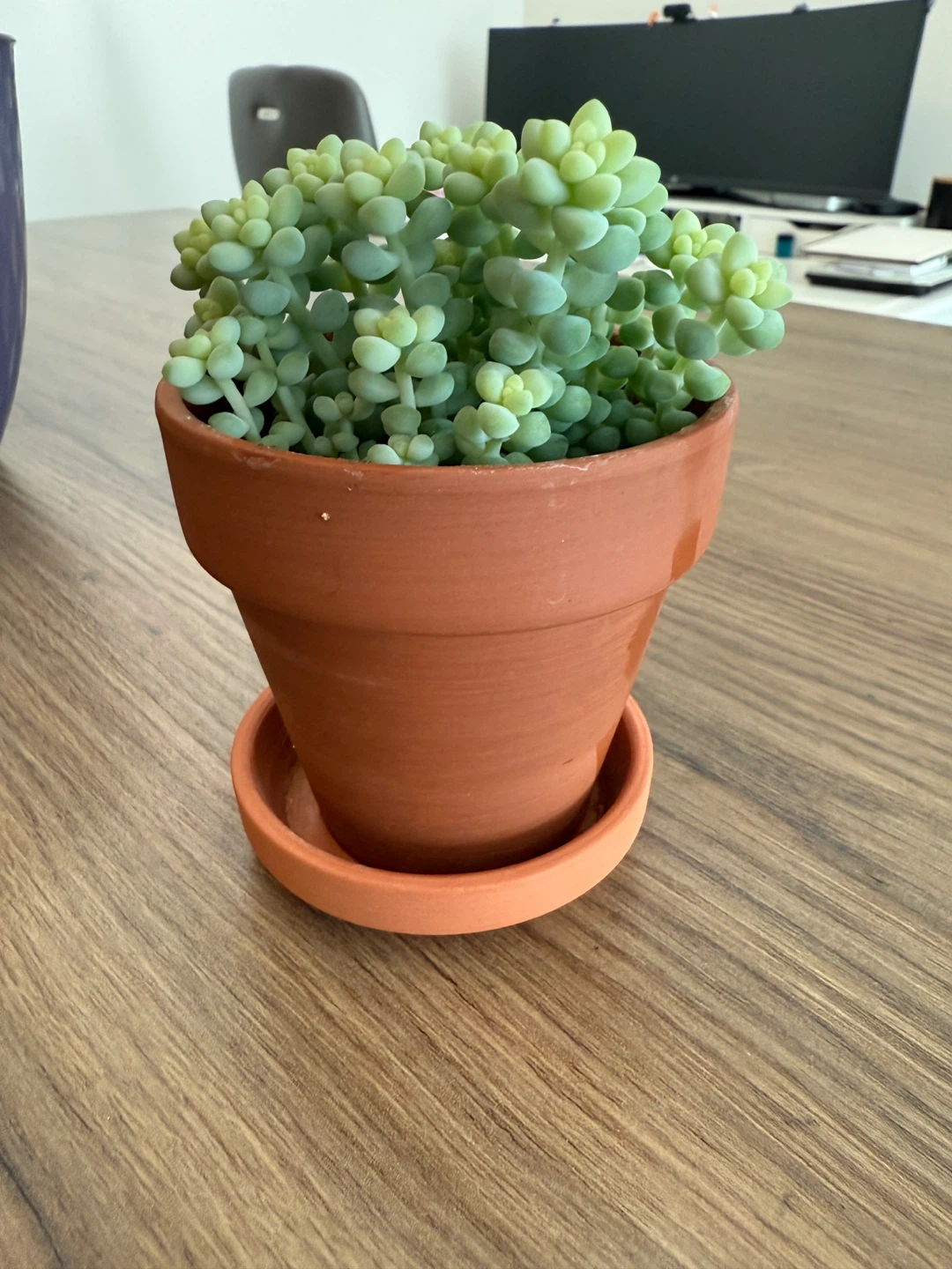A cute little potted Sedum Burrito plant, also known as a Donkey's Tail succulent! It's a healthy and free of pests. Comes in a 3” terracotta pot with saucer.