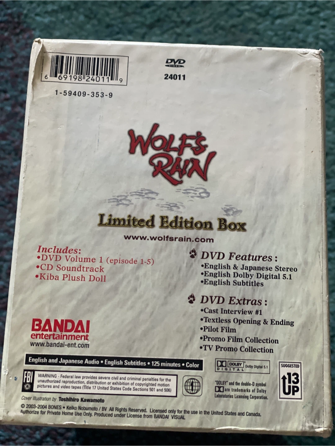 Selling a Wolf's Rain Limited Edition DVD Box Set by Bandai Entertainment! Includes DVD Volume 1 (episodes 1-5), CD Soundtrack, and a Kiba Plush Doll. The set also features English & Japanese Stereo, English Dolby Digital 5.1, and English Subtitles. Plus, there are DVD extras like Cast Interviews, Textless Opening & Ending, Pilot Film, Promo Film Collection, and a TV Promo Collection
