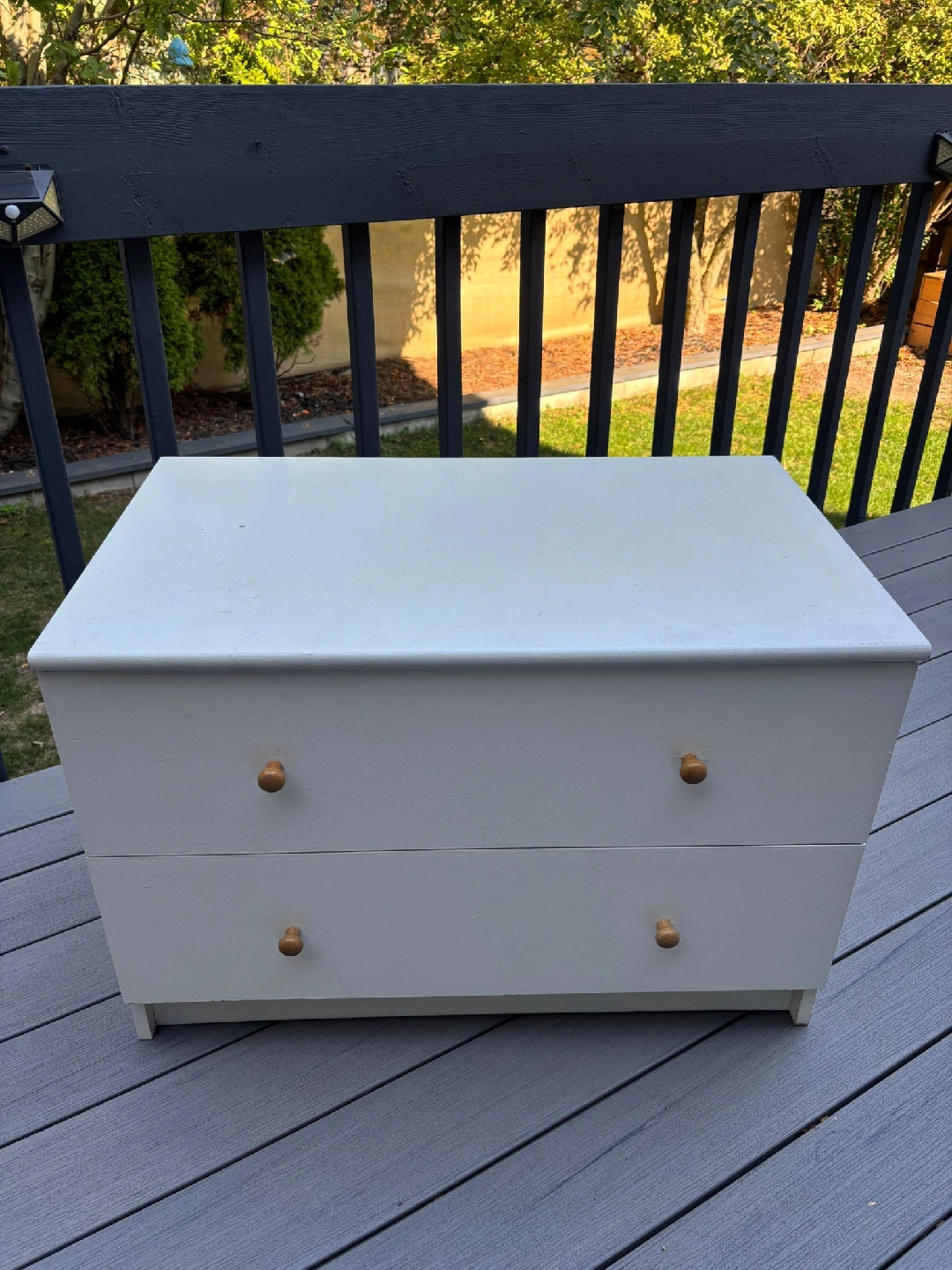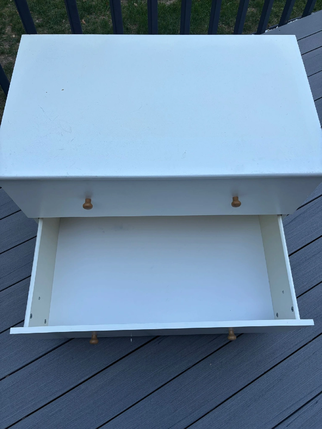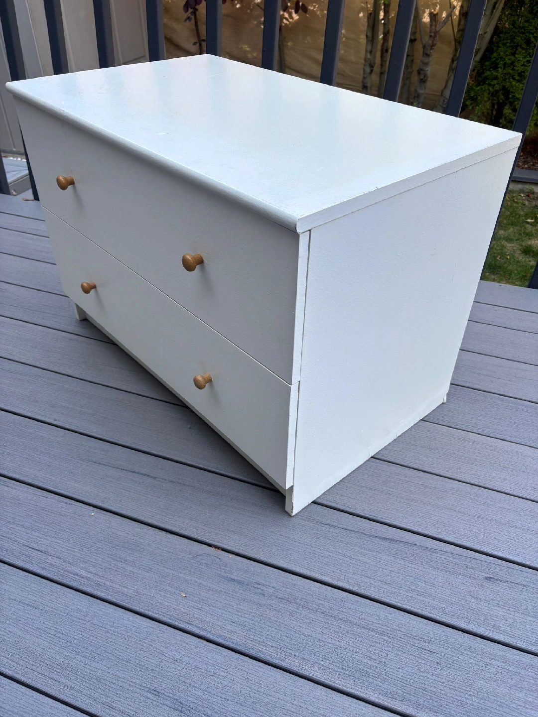 Here's a cute little white dresser with two drawers! It's perfect for a small space or as a bedside table. The drawers slide smoothly and the knobs are a nice natural wood colour. It's in good condition and ready for a new home