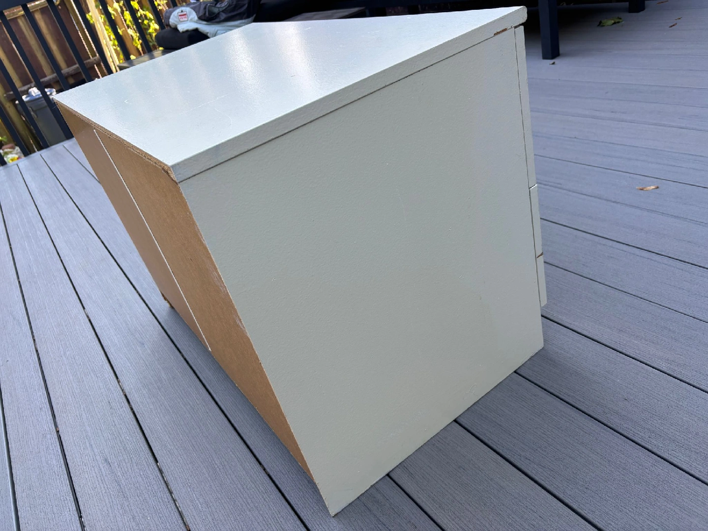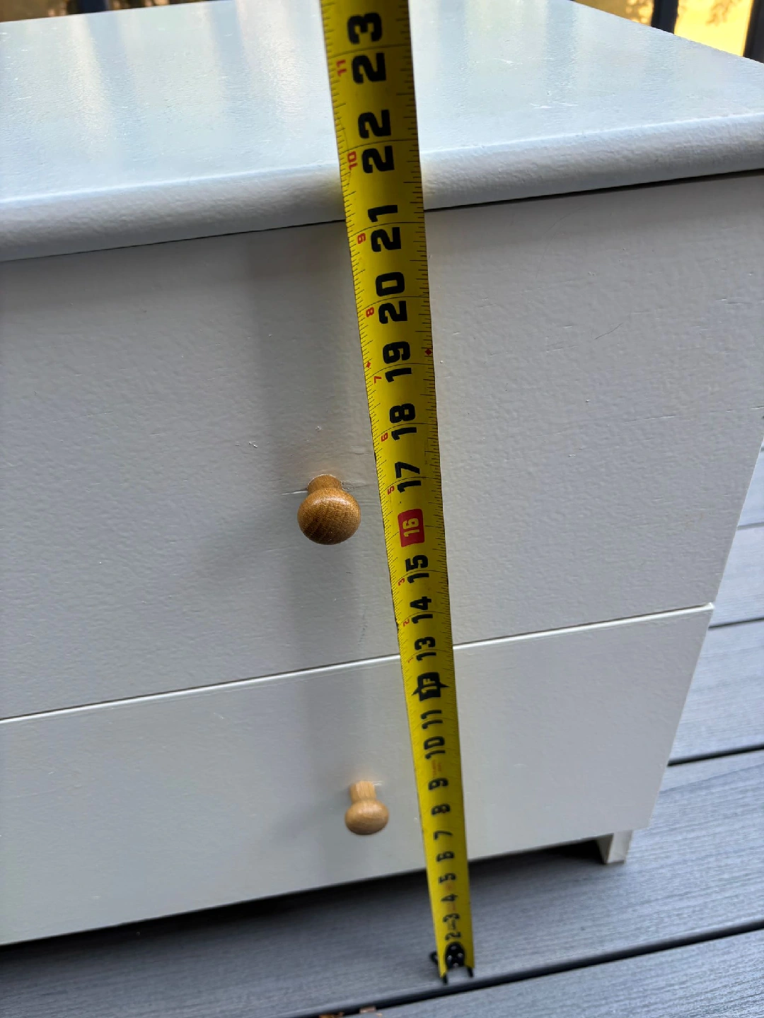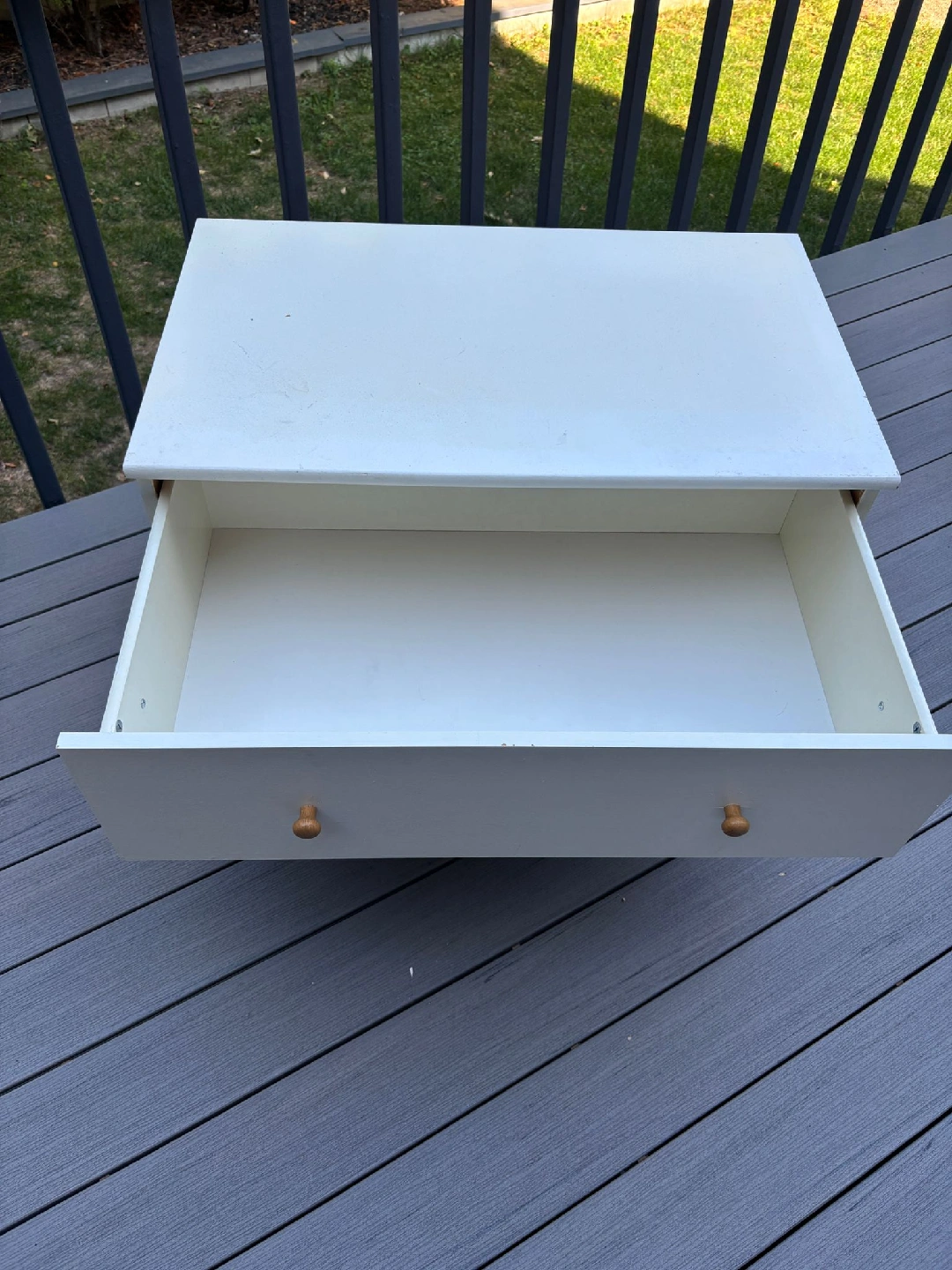 Here's a cute little white dresser with two drawers! It's perfect for a small space or as a bedside table. The drawers slide smoothly and the knobs are a nice natural wood colour. It's in good condition and ready for a new home