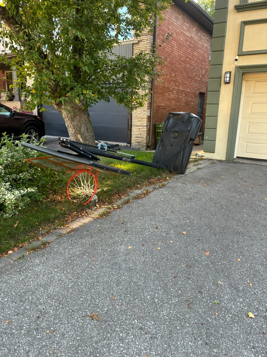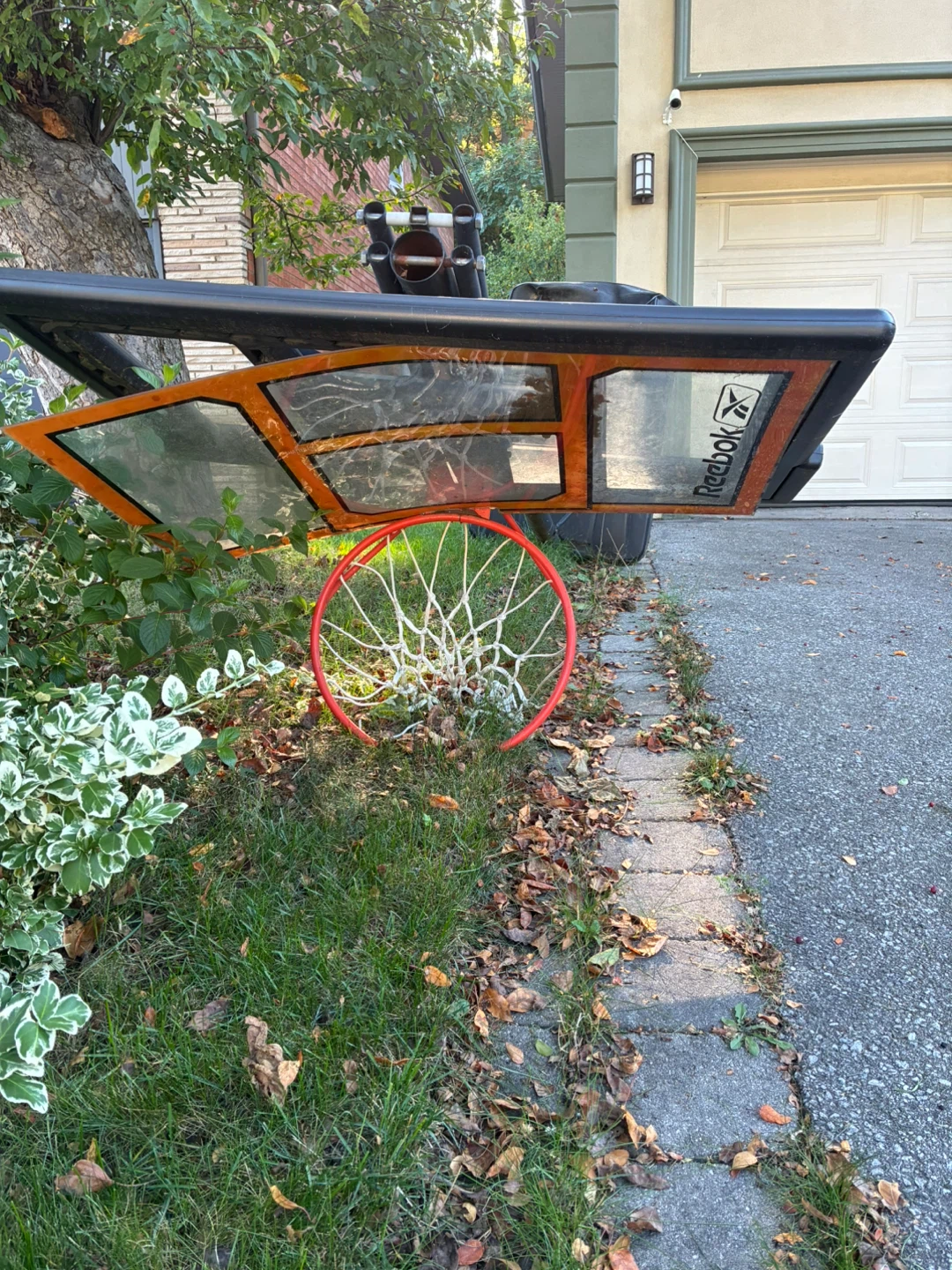 Giving away a Reebok basketball net. It's been sitting in the yard for a bit, so it's showing some wear and tear. It has a slow leak in the base. We tried to fix this with glue but it still leaked. You can try again or fill it with sand instead of water and then it will not be an issue. Our three kids got so much exercise and fun from this but now they’re all away at school. I imagine you would need some sort of truck to cart this away.