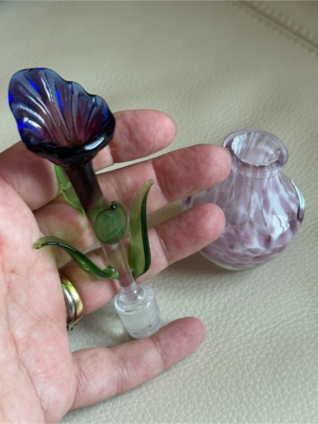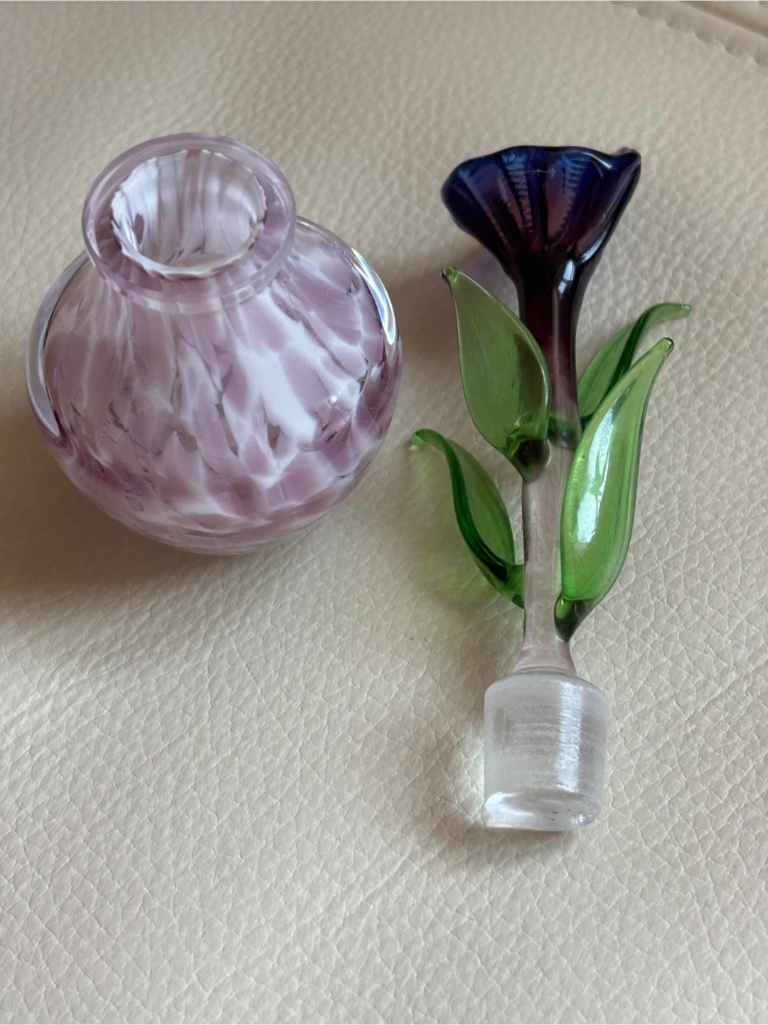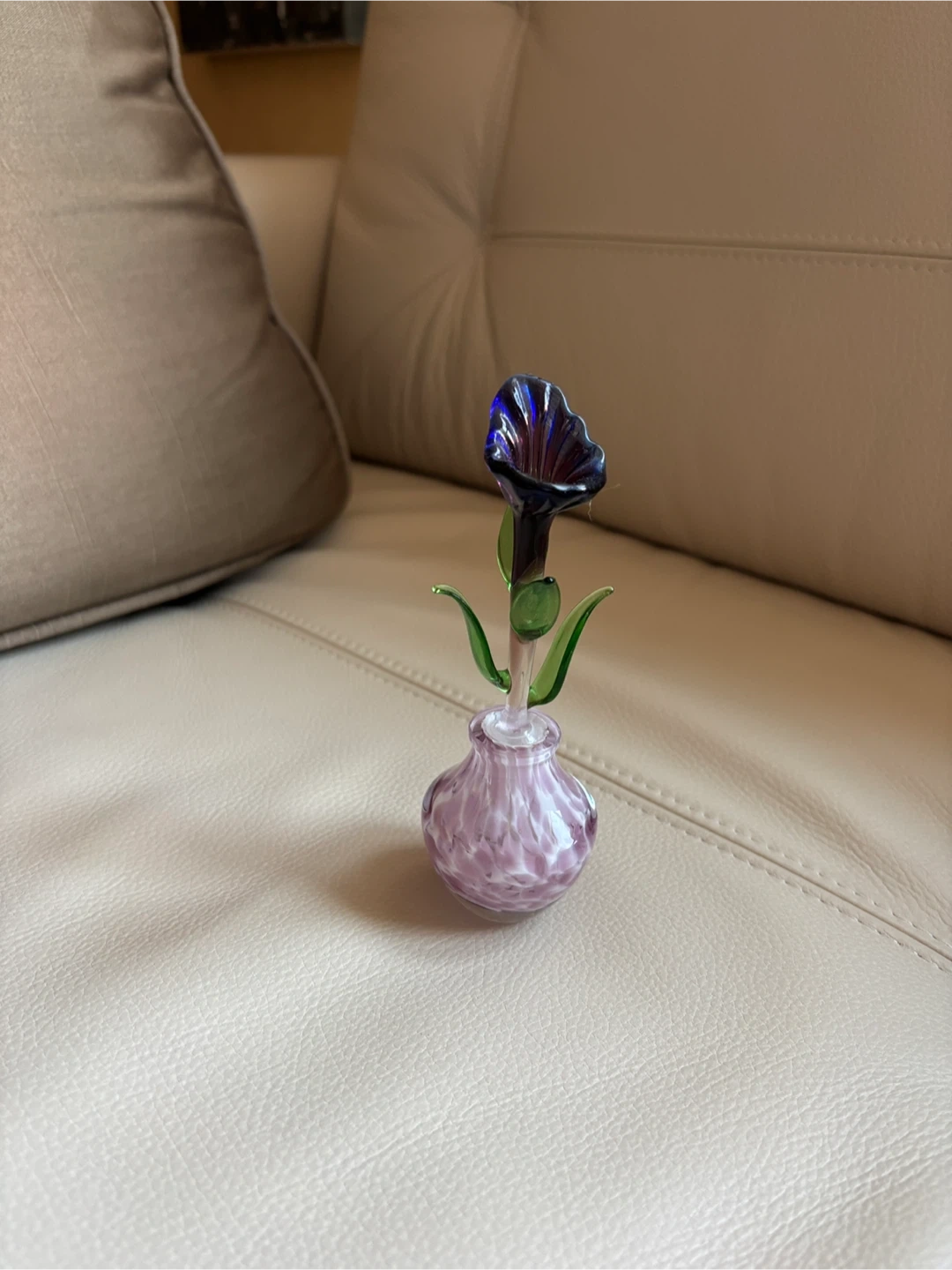 Selling a beautiful glass flower perfume bottle or accent bottle. The flower has a lovely blue and green colour scheme, while the vase is a delicate lilac and white swirl. Perfect as a decorative piece or used for holding perfume or cologne. It stands about 6 inches tall. From a PF and SF home. Pickup only in the St Lawrence market area of downtown Toronto. Cash only.
