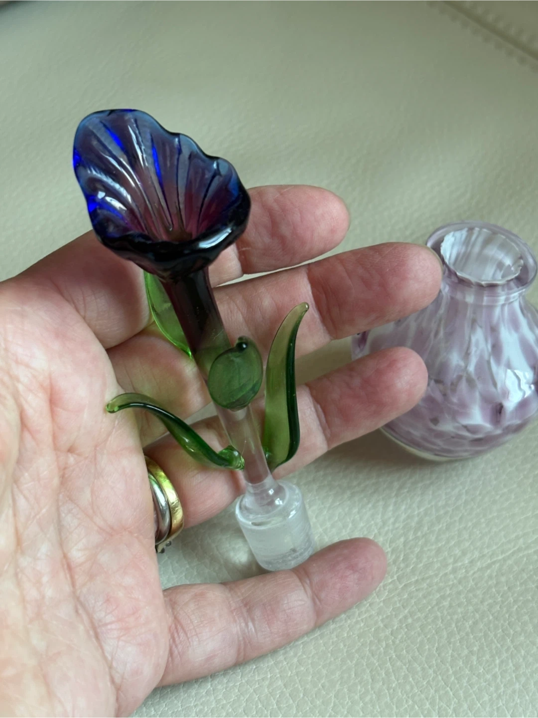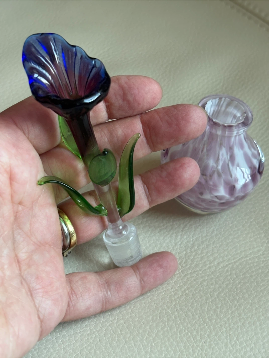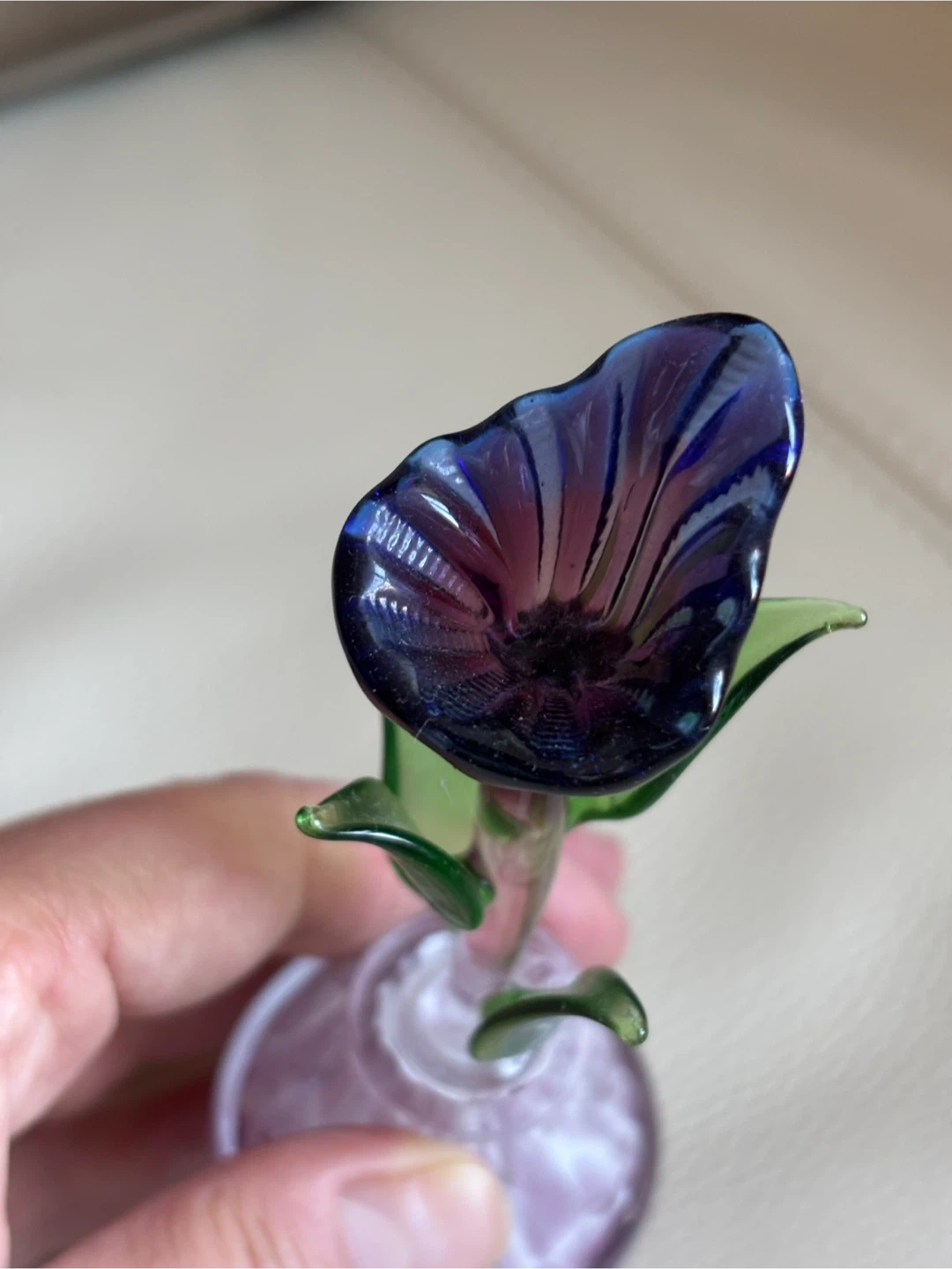 Selling a beautiful glass flower perfume bottle or accent bottle. The flower has a lovely blue and green colour scheme, while the vase is a delicate lilac and white swirl. Perfect as a decorative piece or used for holding perfume or cologne. It stands about 6 inches tall. From a PF and SF home. Pickup only in the St Lawrence market area of downtown Toronto. Cash only.